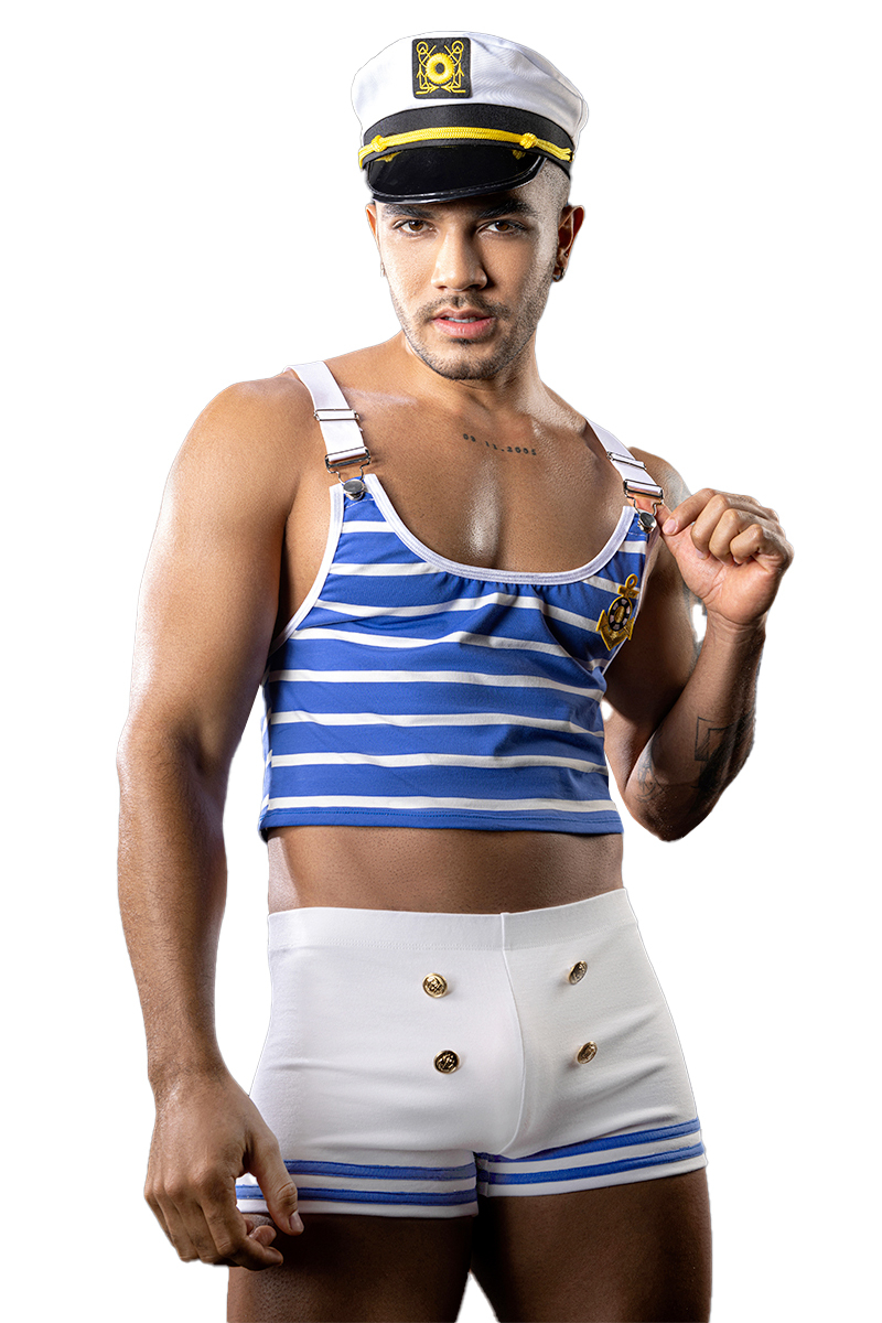 J Lingerie, spécialiste des déguisements coquins, propose cette tenue sexy de matelot composée d'un shorty blanc extensible avec bandes bleues, d'un top débardeur marin assorti et d'une casquette de marin.