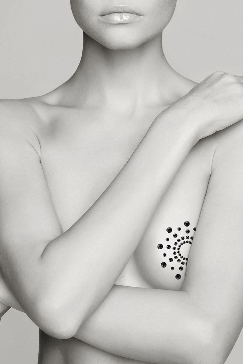 Bijoux de corps composé de strass noirs à poser en corole autour du mamelon.