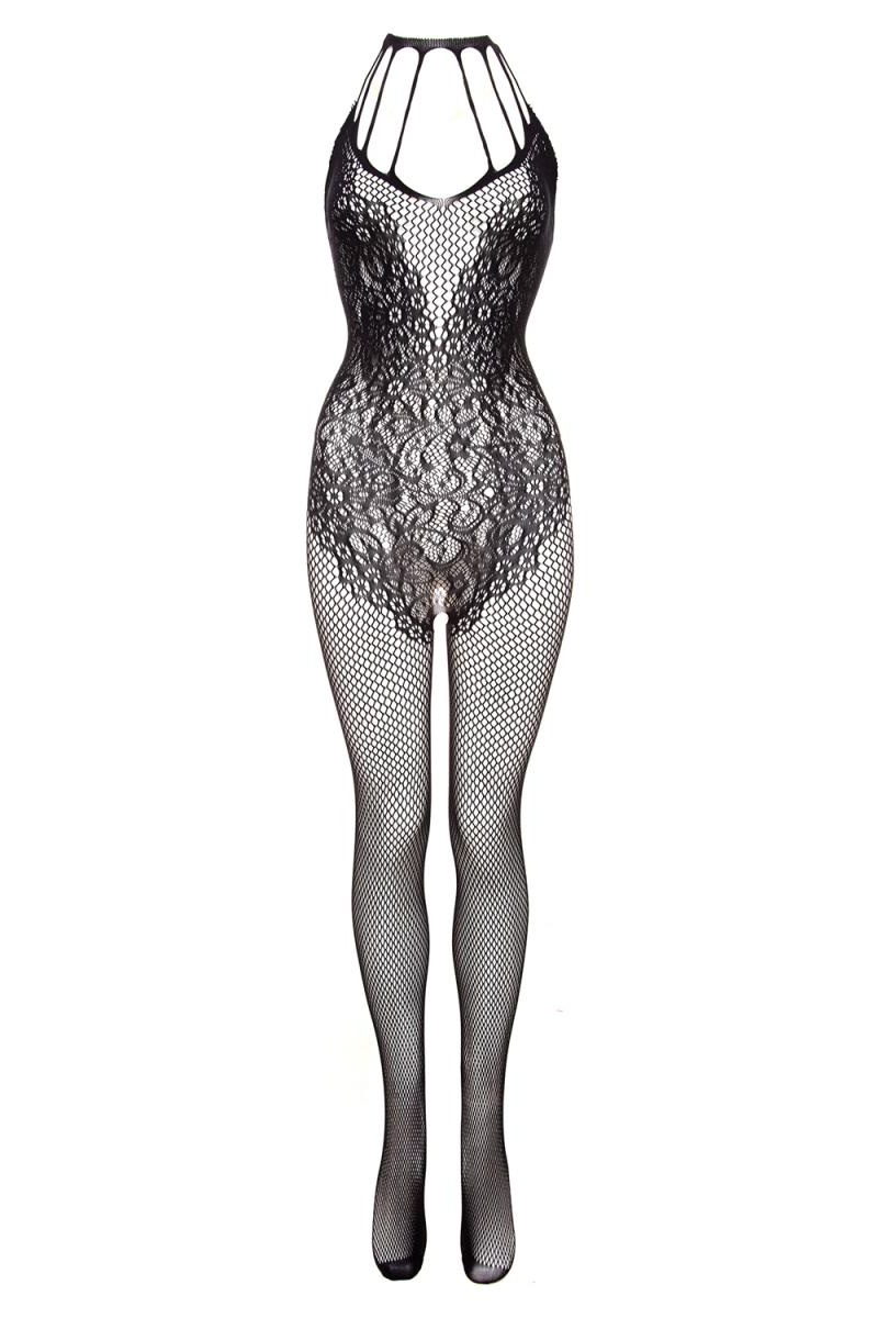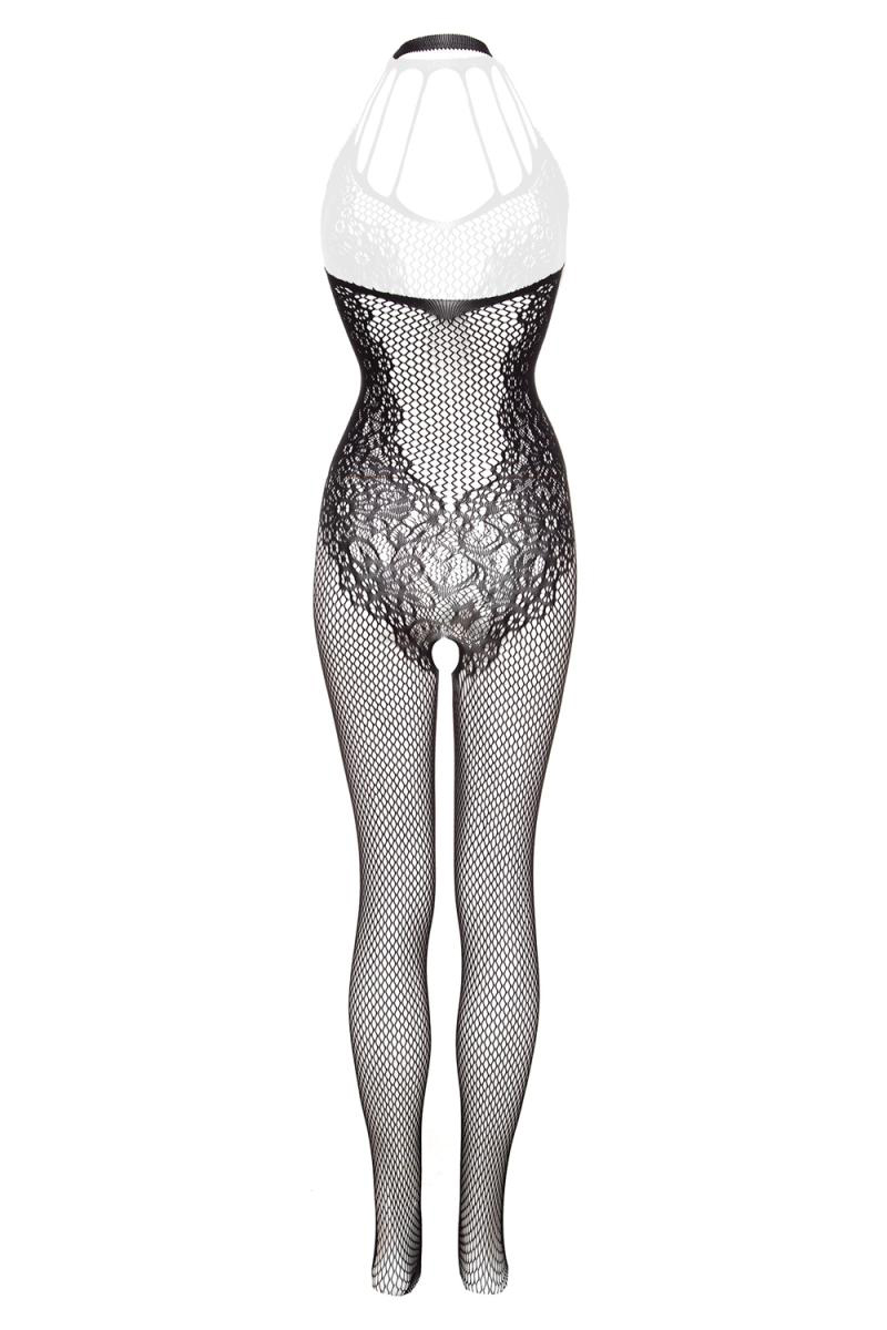 La combinaison Amara de la marque Christine, est une combinaison très sexy en résille et dentelle florale, ouverte à l'entrejambe.