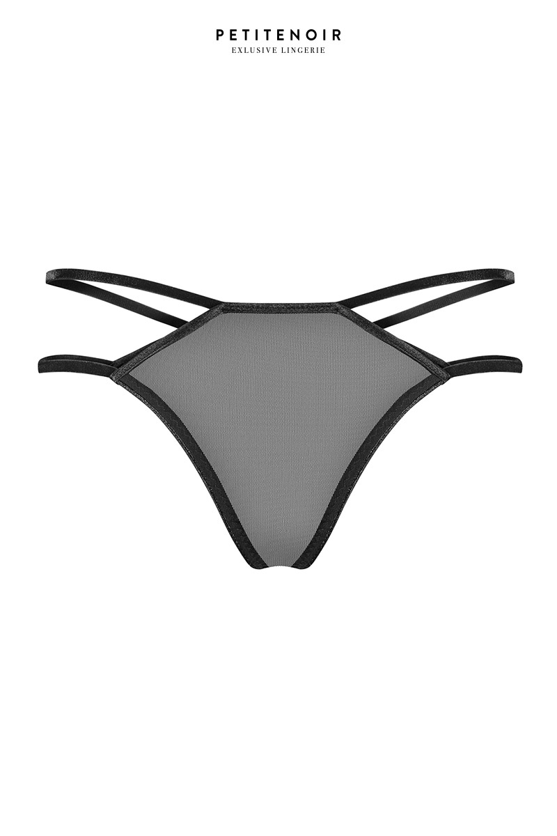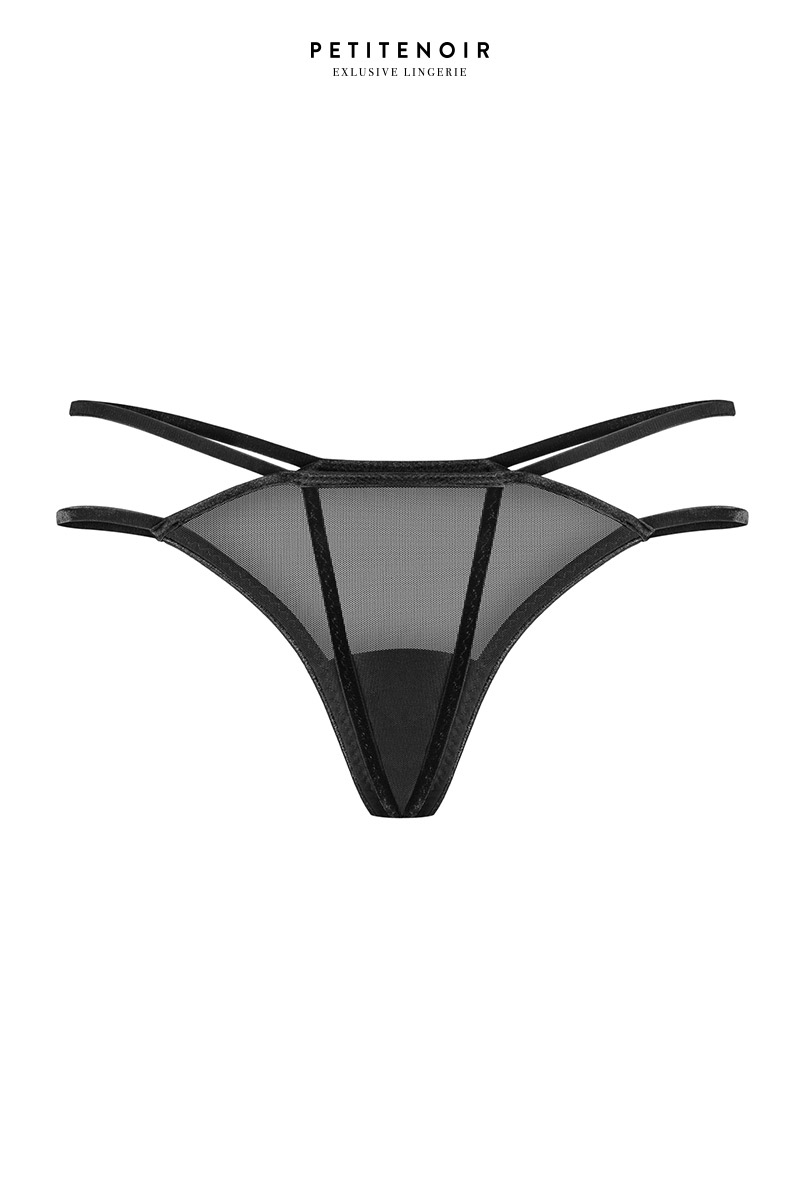 Ce string fort en style est une séduisante lingerie qui étend ses lanières de velours haut sur les hanches pour mettre en valeur la délicatesse du pubis et la rondeur des fesses, à peine cachés par le tulle délicat.