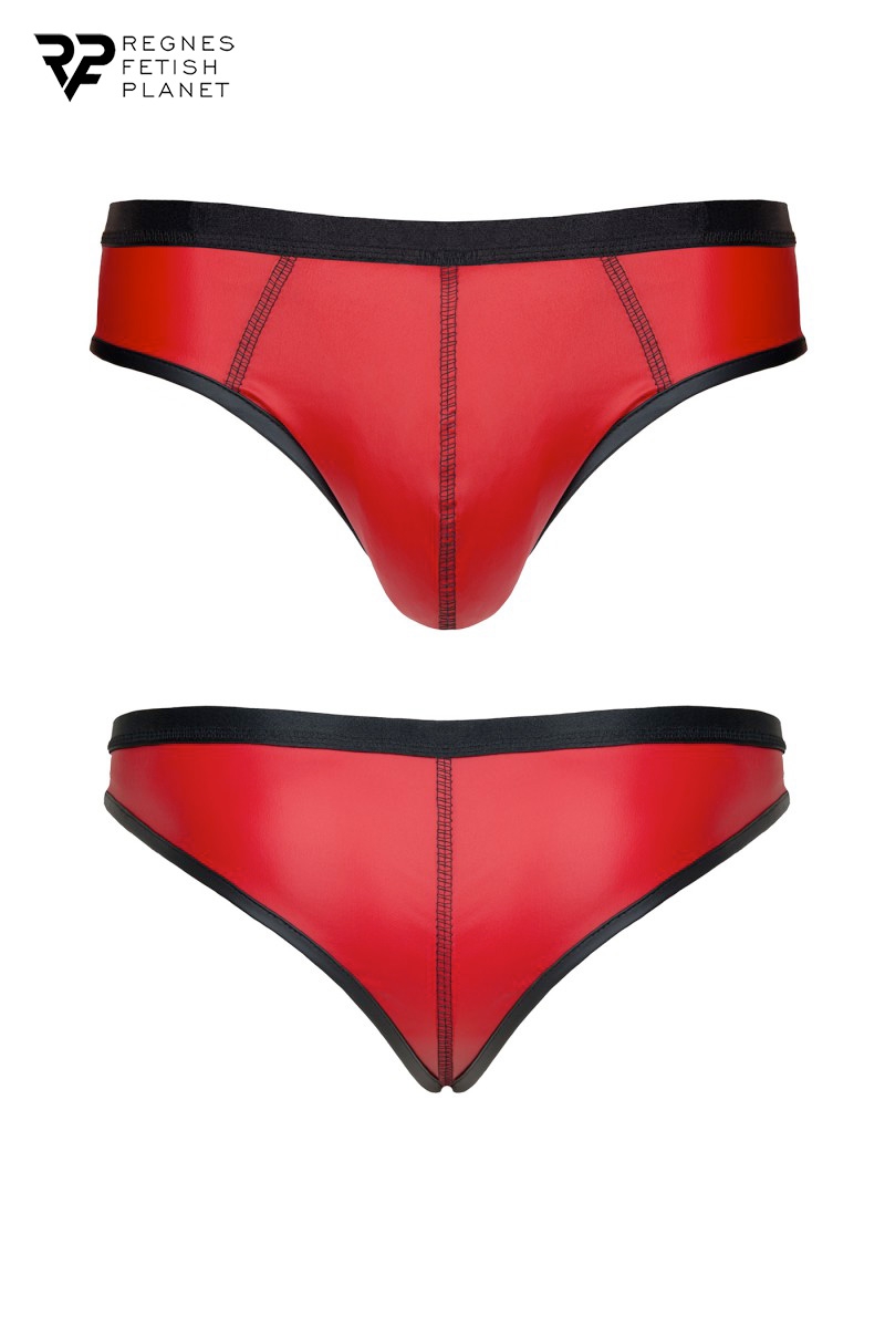 Slip rouge et noir fabriqué par Regnes Fetish Planet de style brésilien en wetlook avec une ceinture noire extensible. Ce slip bicolore est en tissu confortable et vous assure un bon maintien des parties génitales. La coquille rouge a des coutures visibles noires sur le côté et le milieu.