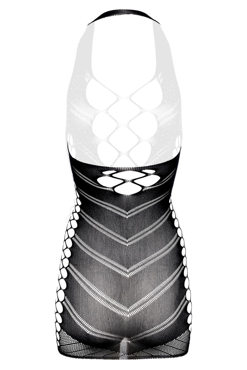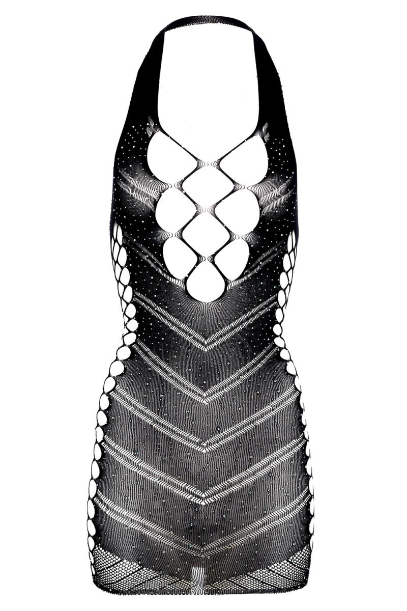 La marque de lingerie sexy Christine présente la robe courte Amethille, une robe sexy noire en mailles super élastiques, ornée de strass sur le devant.