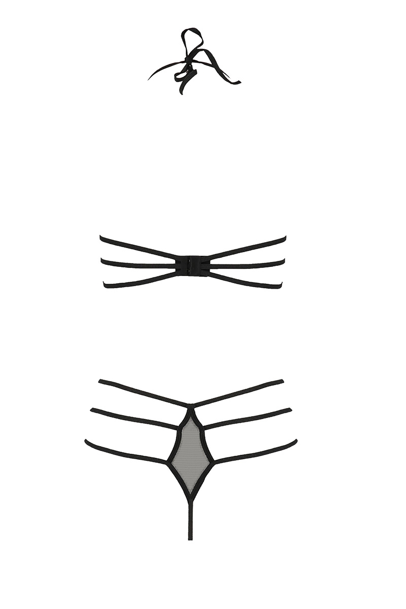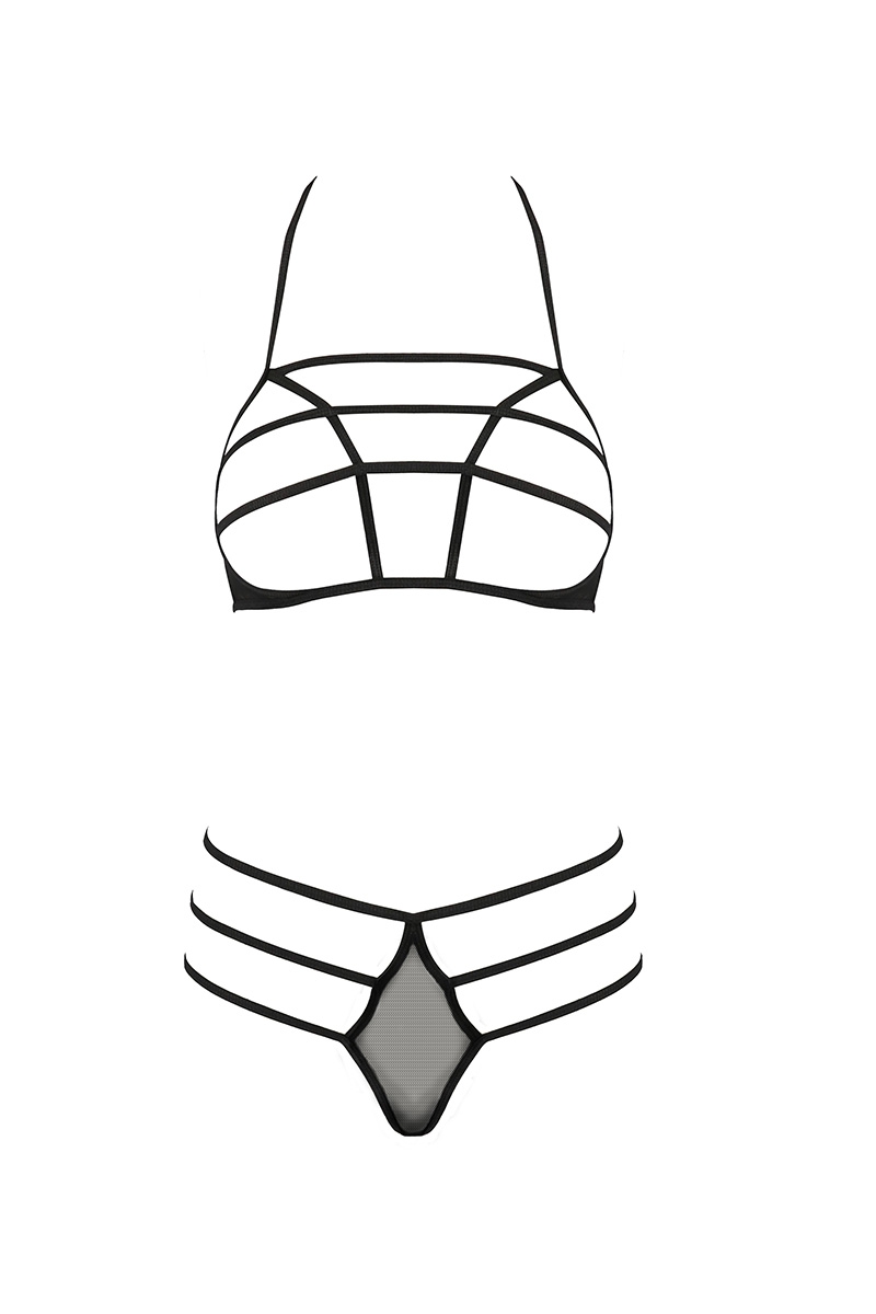 Le soutien-gorge découvre les seins et présente de fines lanières horizontales, verticales et une fine bande de tissu sous les seins apporte du soutien à la poitrine.