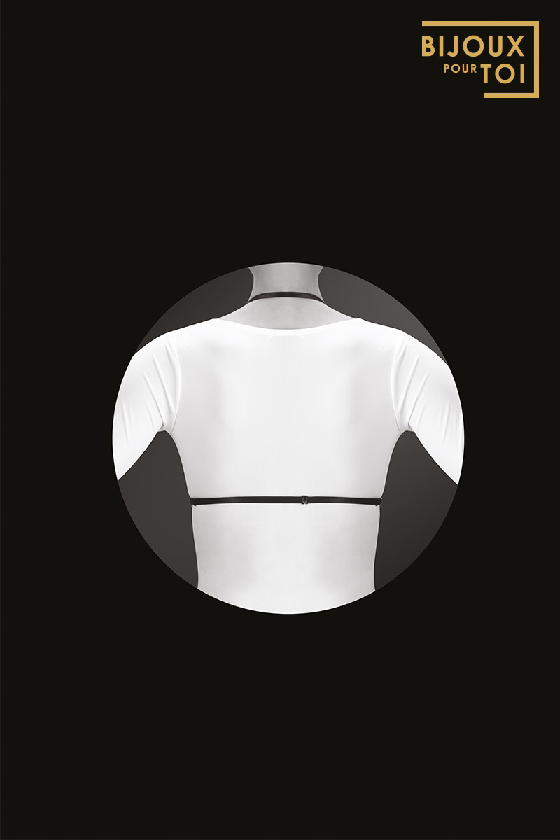 Ce harnais de corps de la marque Bijoux Pour Toi possède un réglage d'ajustement et une attache dans le dos.