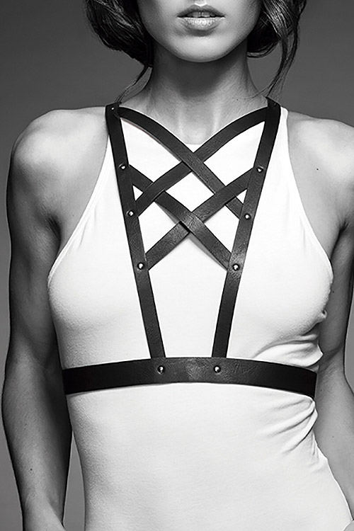 Harnais croisé marron, d'inspiration BDSM, par Maze, pour mettre en valeur la poitrine.