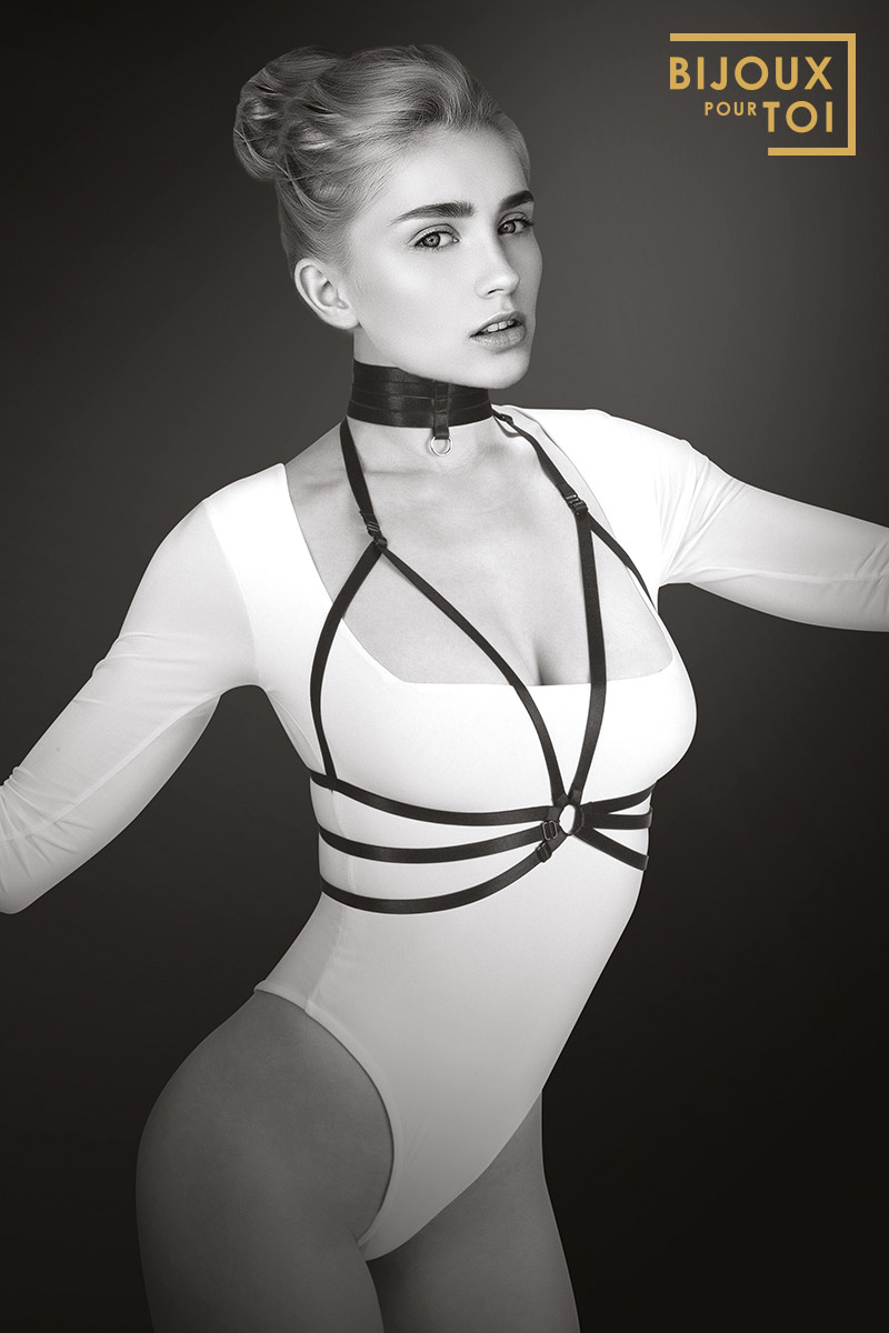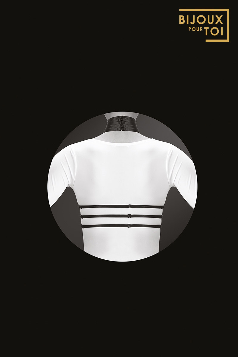 Harnais noir Julia, par Bijoux pour toi, composé de deux pièces indépendantes: le harnais et le tour de cou. Harnais et tour de cou sont réglables.