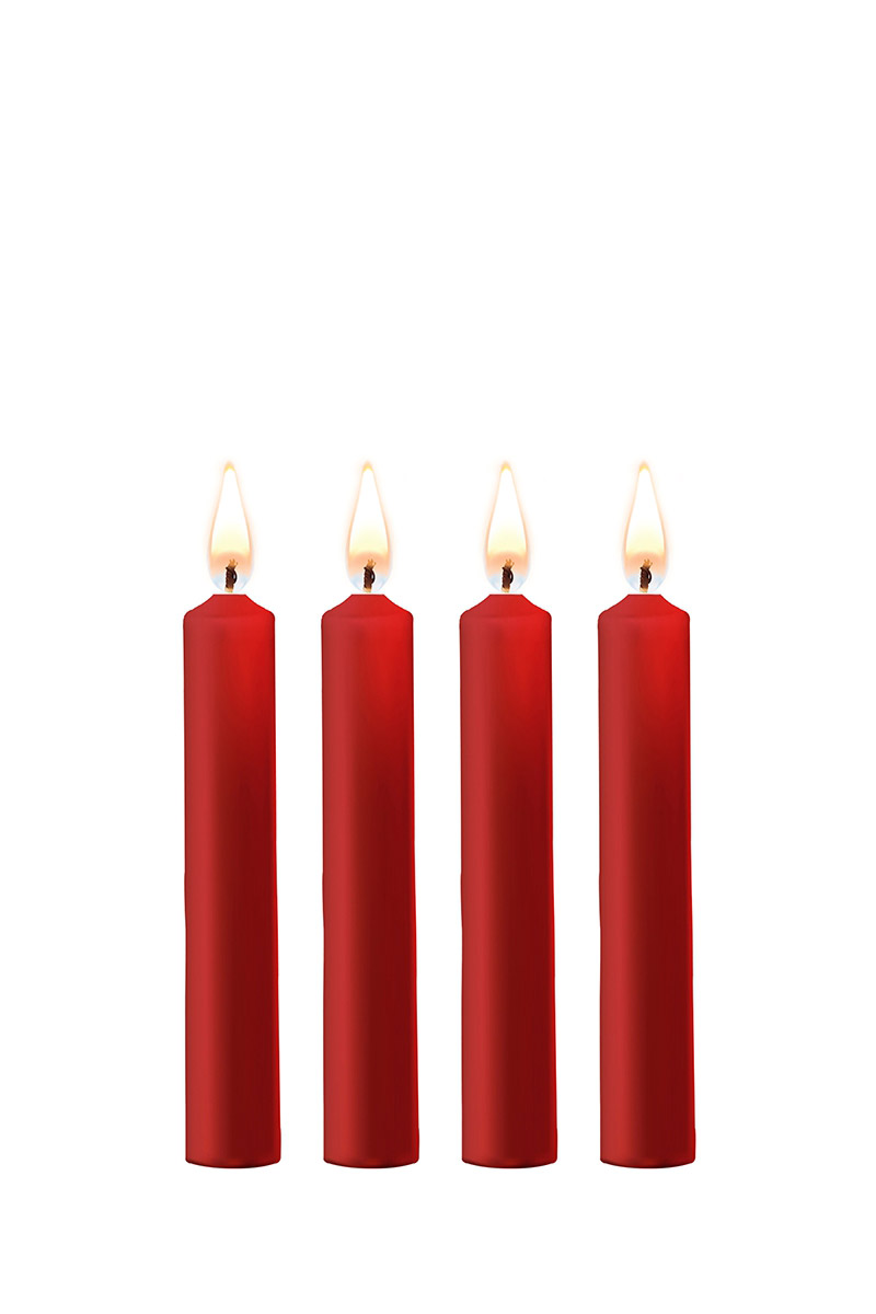 4 bougies basse température, dimensions 12 x 1,7 cm, de couleur rouge, spécialement créées pour les jeux de cire, par Ouch! le spécialiste des accessoires BDSM.