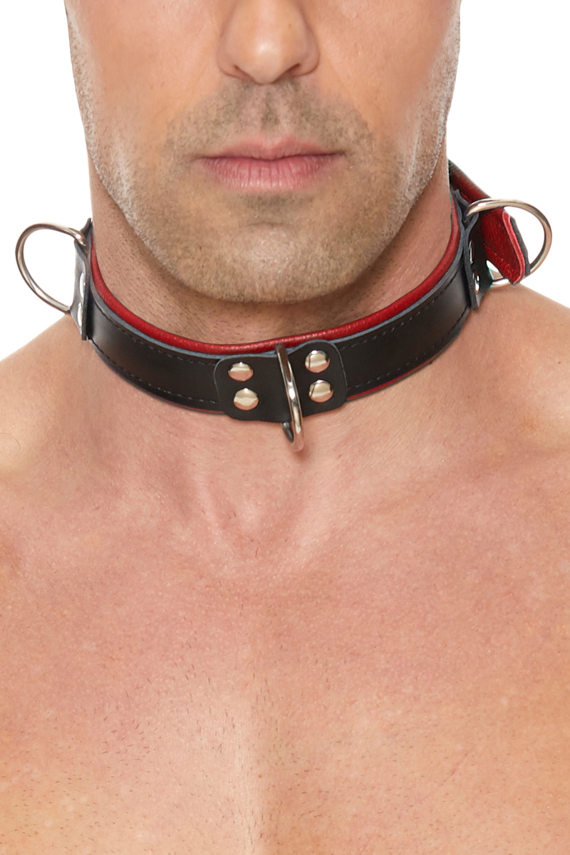 Collier BDSM Ouch! de grande qualité, pour hommes et femmes, en cuir reconstitué rouge surpiqué de noir, équipé de 3 solides anneaux en D permettant d'y accrocher toutes sortes d'accessoires : menottes, cordes, chaines, etc.