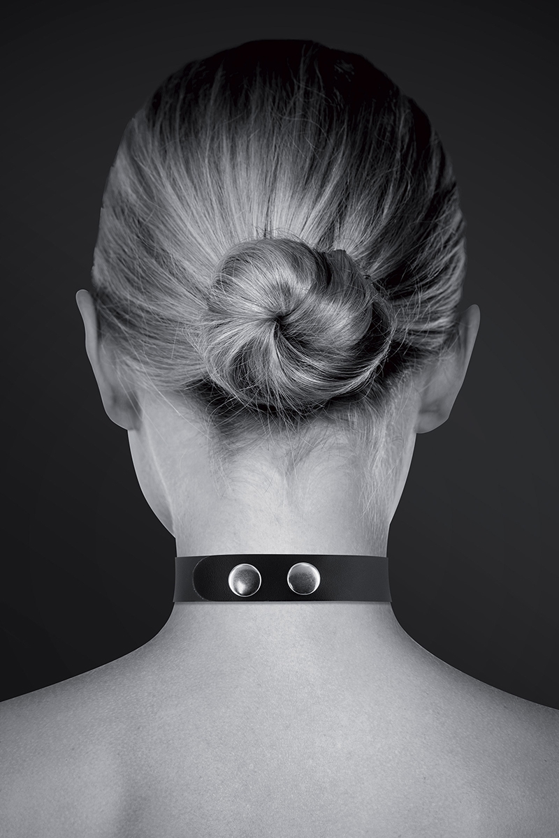 Bijoux pour toi propose ce collier de soumission en cuir noir, Réglable par bouton pression, avec sur le devant l'inscription « SLAVE » en strass.