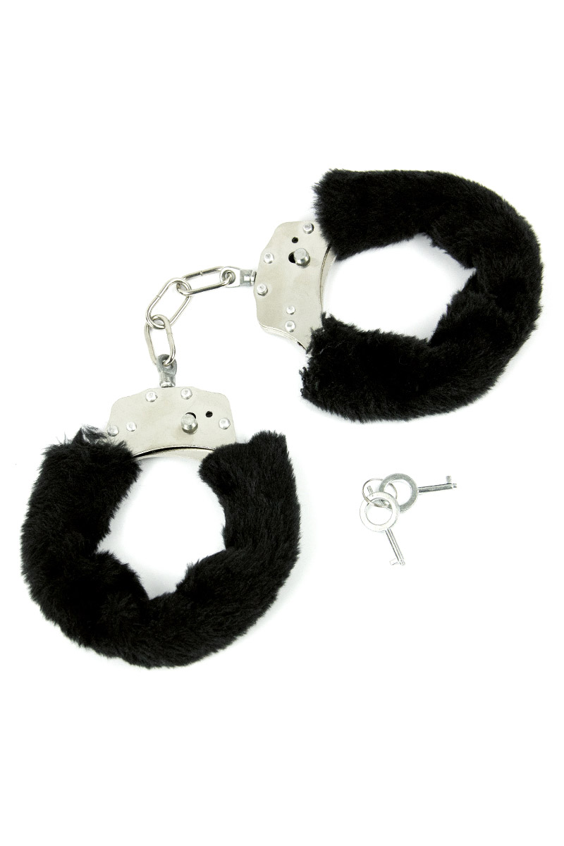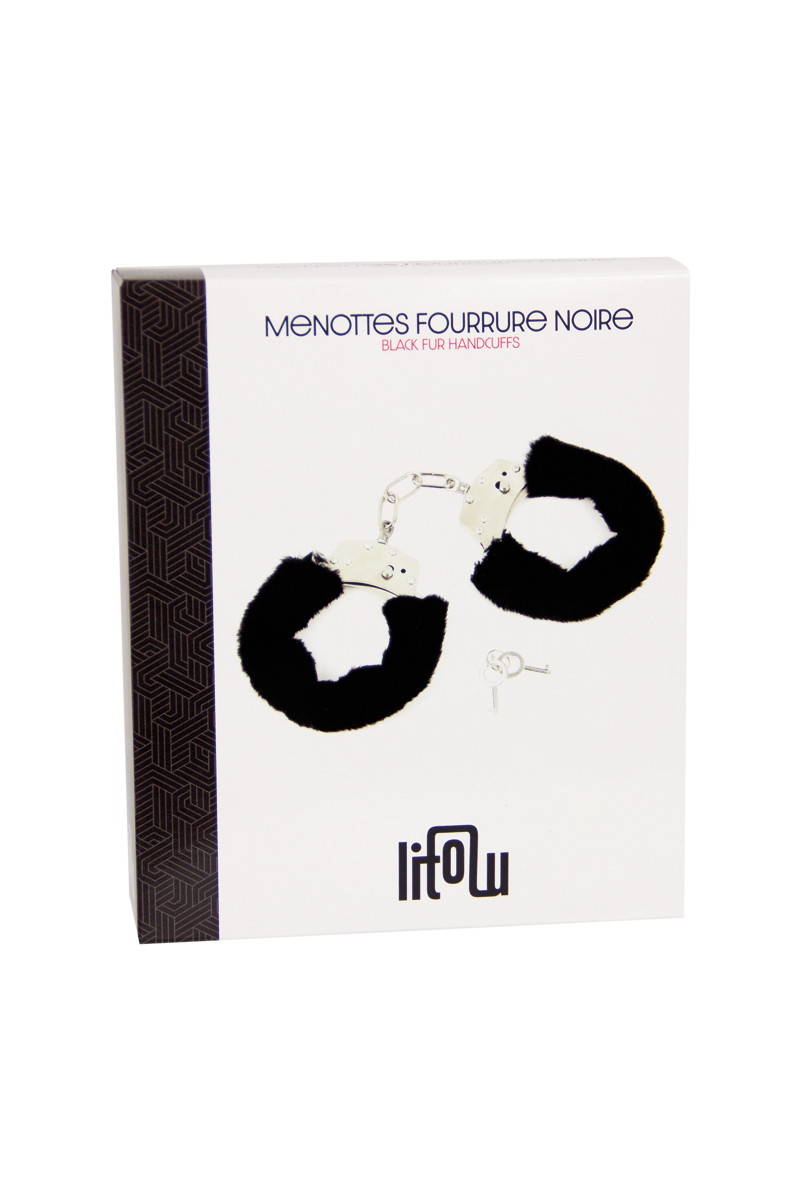 Menottes fantaisie fonctionnelles comme des vraies, en métal et fausse fourrure noire, avec fermeture à clé + 2 clés fournies, par la marque française Litolu.