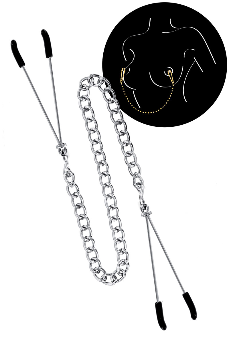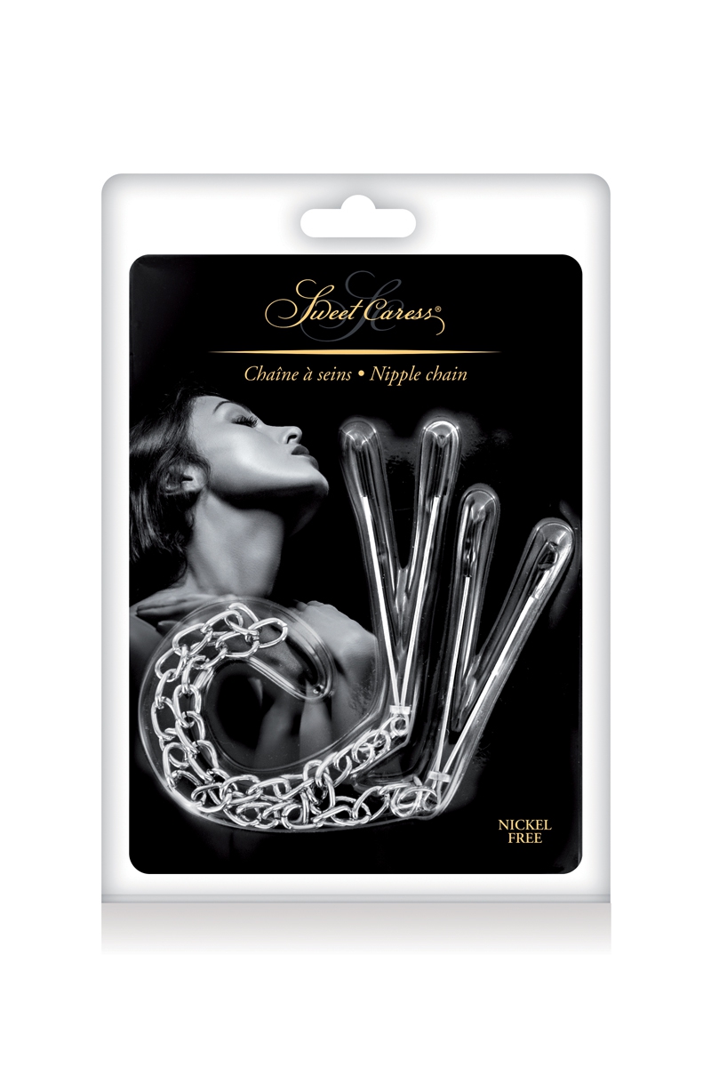 Pinces à seins + chainette Sweet Caress. Réglage de la pression des pinces avec la bague métallique.