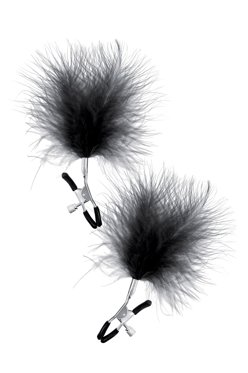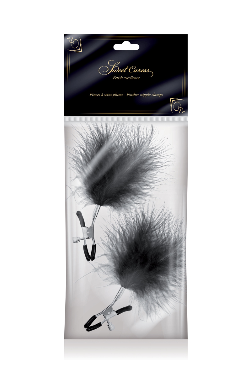 Pinces à seins Sweet Caress avec plumeau noir. Réglage de la pression grâce à la vis sur le coté des pinces.