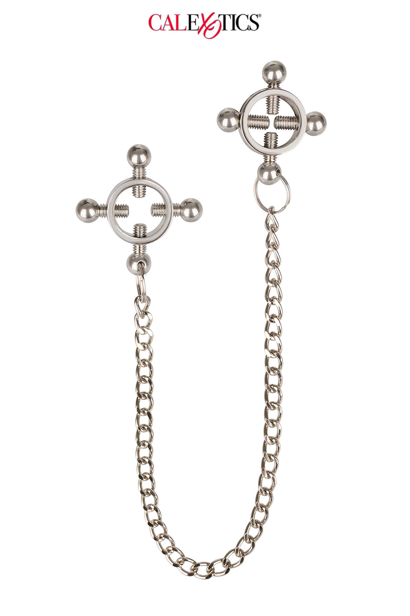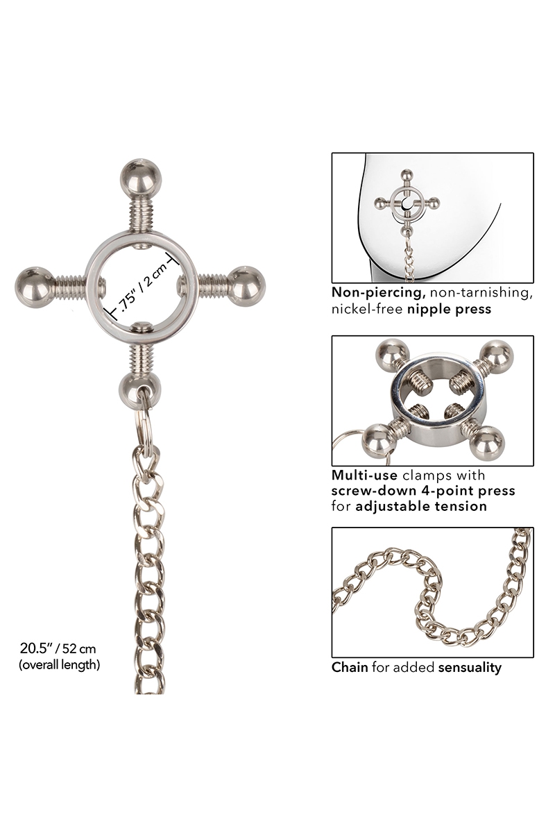La marque Calexotics propose les pinces Nipple Grips 4-Point Nipple Press With Chain, deux pinces à tétons entièrement réglables, avec un système de serrage par 4 points à l'intérieur d'un anneau en acier inoxydable et une chaîne acier inoxydable de 52 cm reliant les deux anneaux.