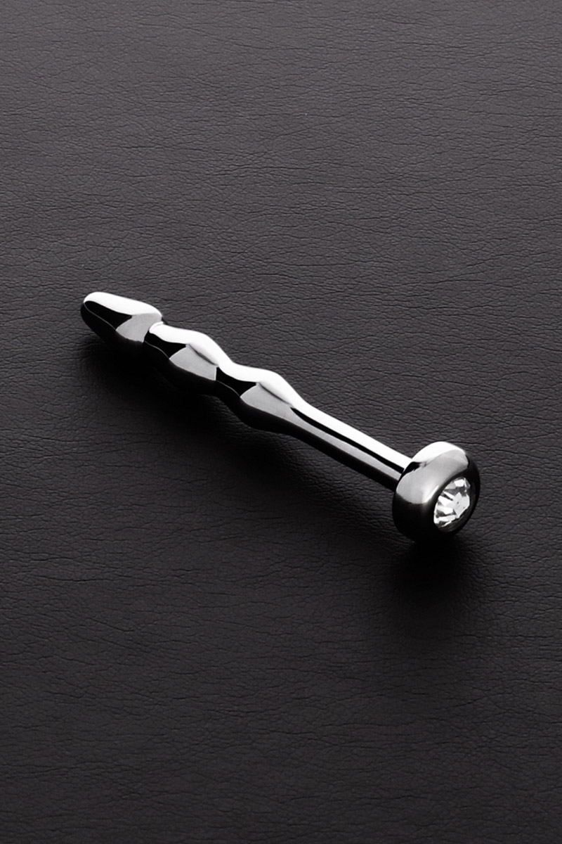 Magnifique plug de pénis en acier inoxydable poli, orné d'un bijou strass de type cristal à sa base.