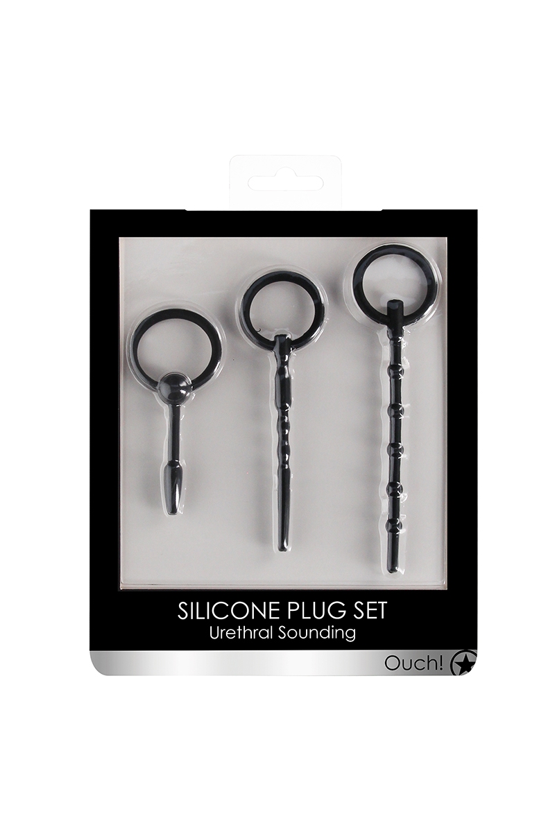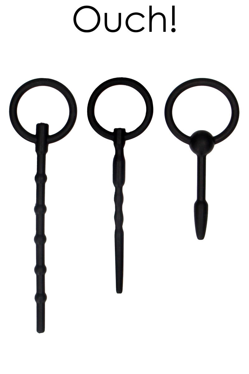 La marque Ouch! propose ce set de 3 plugs urétraux de tailles et textures différentes (55 à 129 mm d'insertion), en silicone haute qualité, pour les amateurs de jeux médicaux et BDSM.