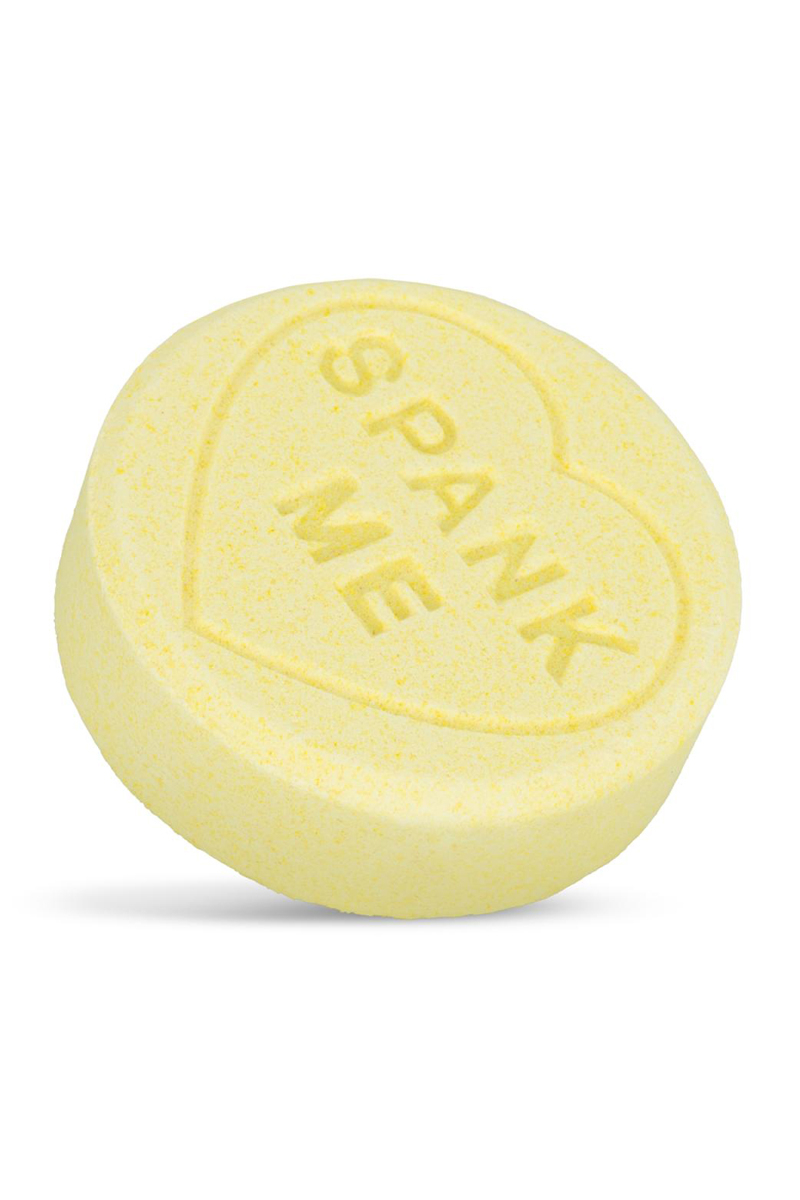 La Bath Bomb Spank me de la marque easytoys est une bombe de bain en forme de galet circulaire de couleur jaune, parfumée au citron, avec le message spank me gravé à la surface de la bombe.