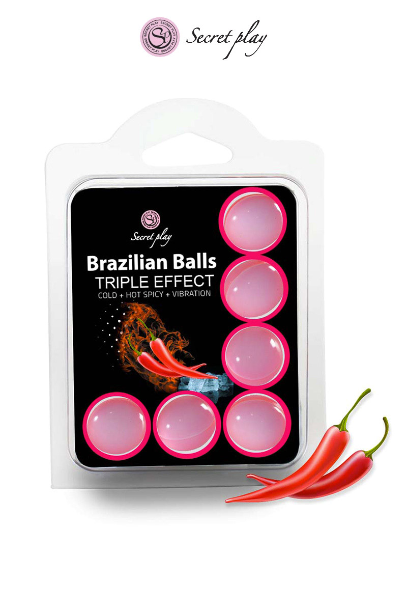Blister contenant 6 Brazilian Balls. Elles sont fabriquées au Brésil et vendues sous la marque Espagnole Secret Play. Elles se dissolvent avec la chaleur du corps et se transforment en liquide stimulant et lubrifiant.