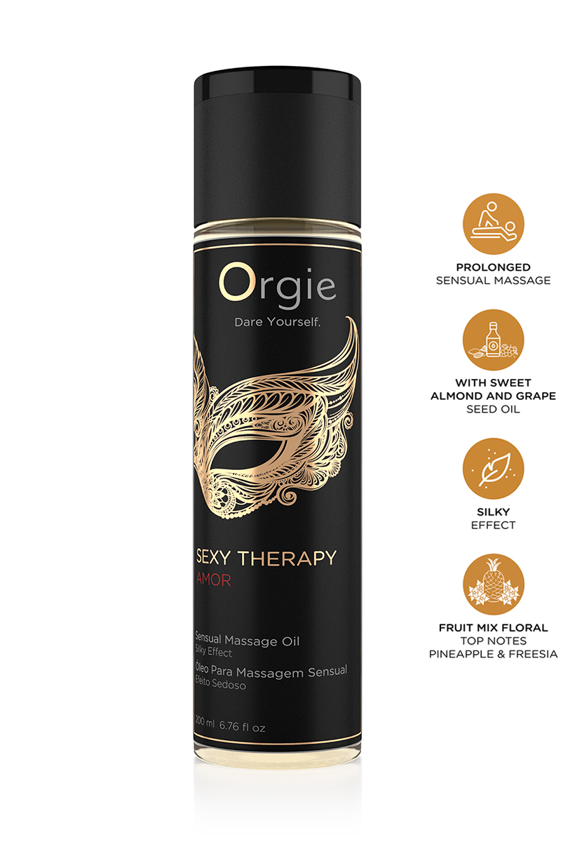 Orgie propose son huile de massage Sexy Therapy Amor, une huile hybride minérale au parfum stimulant de fleurs et de fruits mélangés (avec notes de tête ananas et freesia), dédiée aux massages sensuels du corps.