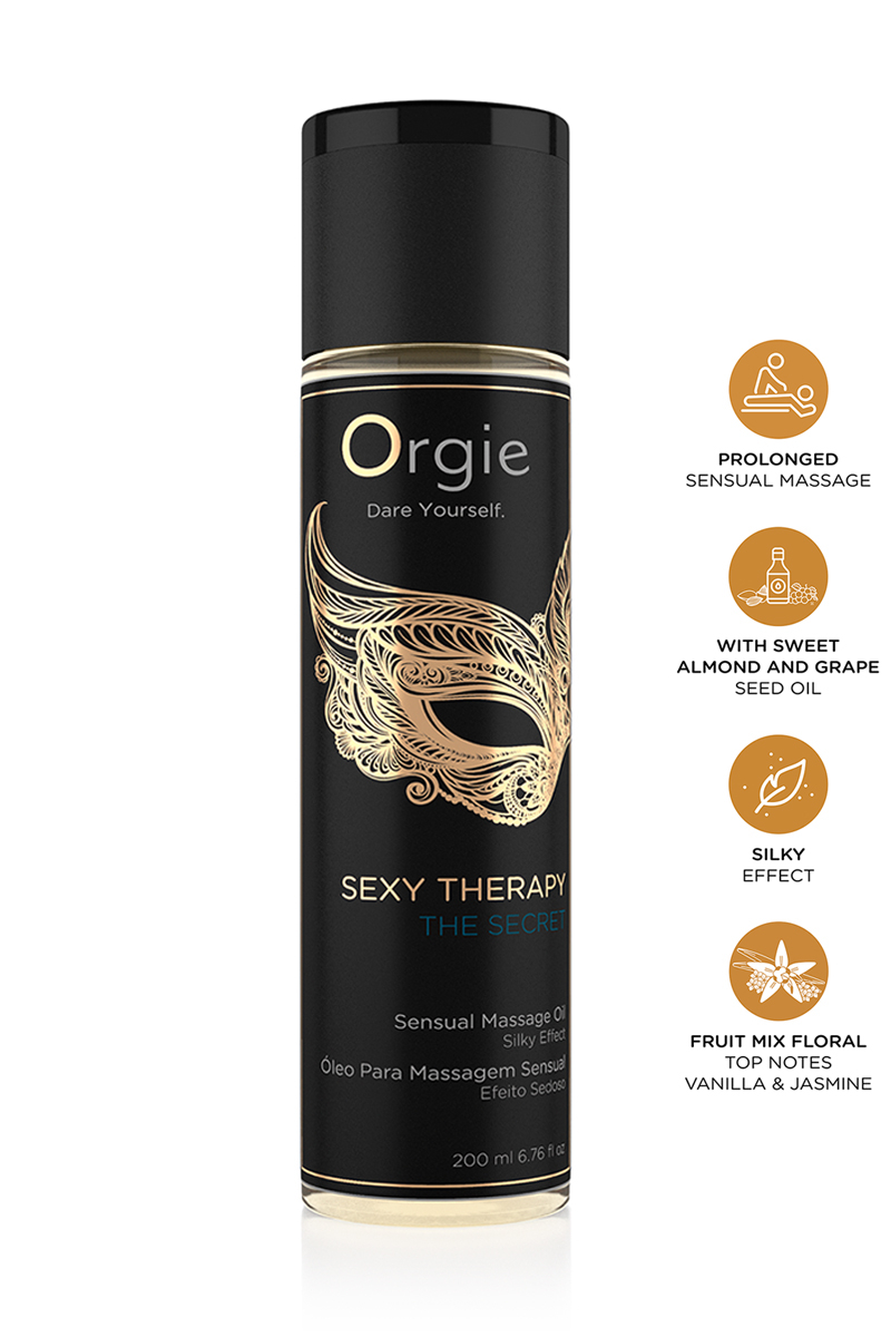 Orgie propose son huile de massage Sexy Therapy The Secret, une huile hybride minérale au parfum stimulant floral mix de fruits (vanille et jasmin), dédiée aux massages sensuels du corps.
