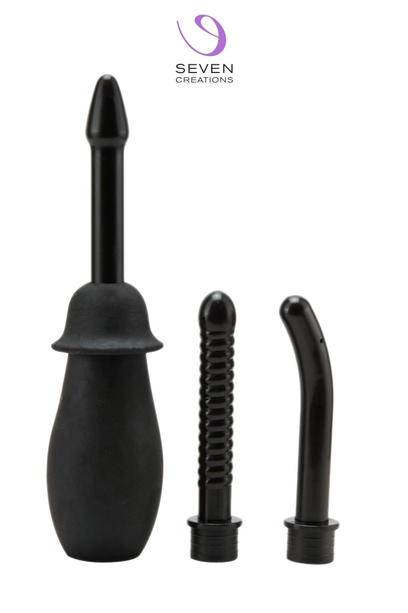 Poire à lavement unisexe Seven Création proposée avec 3 canules amovibles interchangeables : 1 canule avec tête courbée + 1 canule striée + 1 canule avec extrémité en pointe de flèche.br />