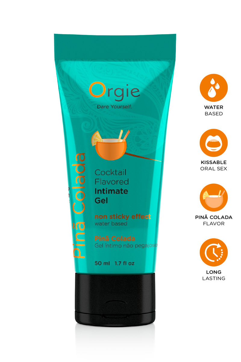 La marque Orgie propose Lube Tube Cocktail Piña Colada, en tube de 50 ml, un gel intime embrassable (le top pour le sexe oral) à base d'eau, longue durée et délicieusement parfumé au cocktail Piña Colada.