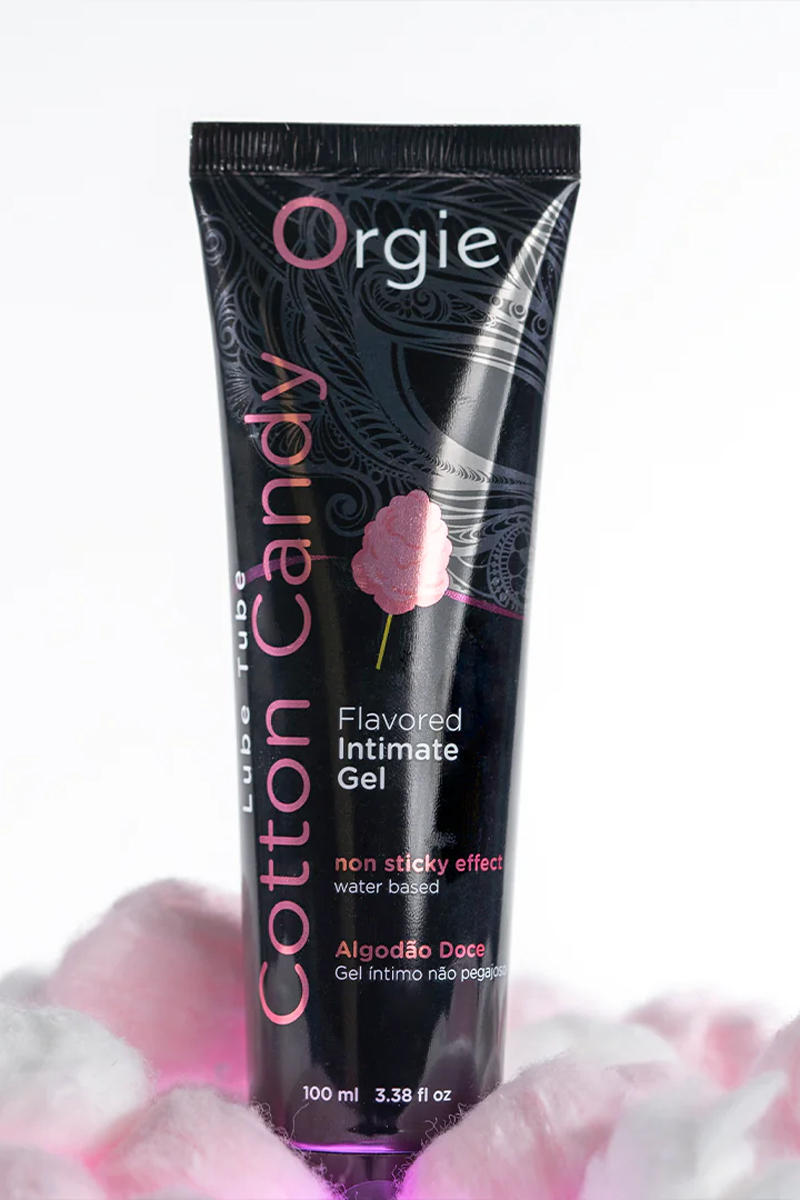 La marque Orgie propose Lube Tube Cotton Candy, en tube de 100 ml, un gel intime embrassable (le top pour le sexe oral) à base d'eau, longue durée et délicieusement parfumé à la barbe à papa.