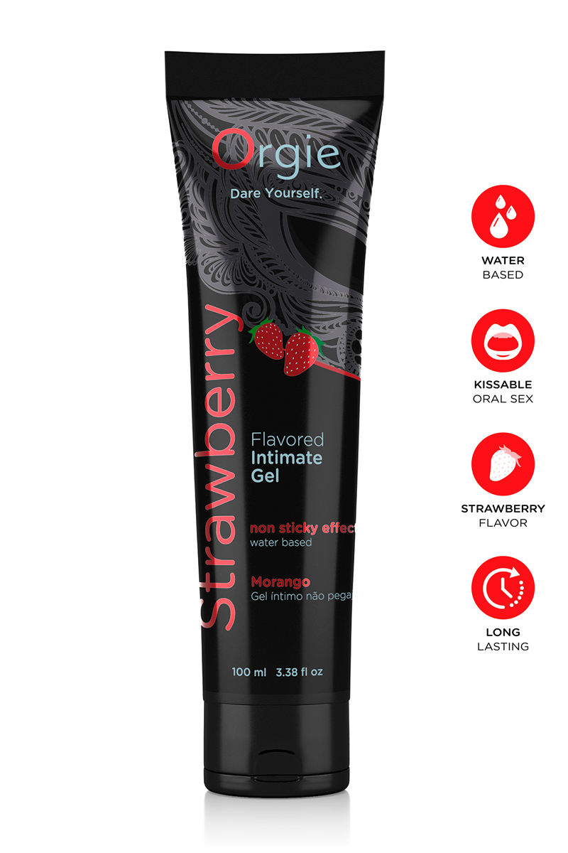 La marque Orgie propose Lube Tube Straberry, en tube de 150 ml, un gel intime embrassable (le top pour le sexe oral) à base d'eau, longue durée et délicieusement parfumé à la fraise.
