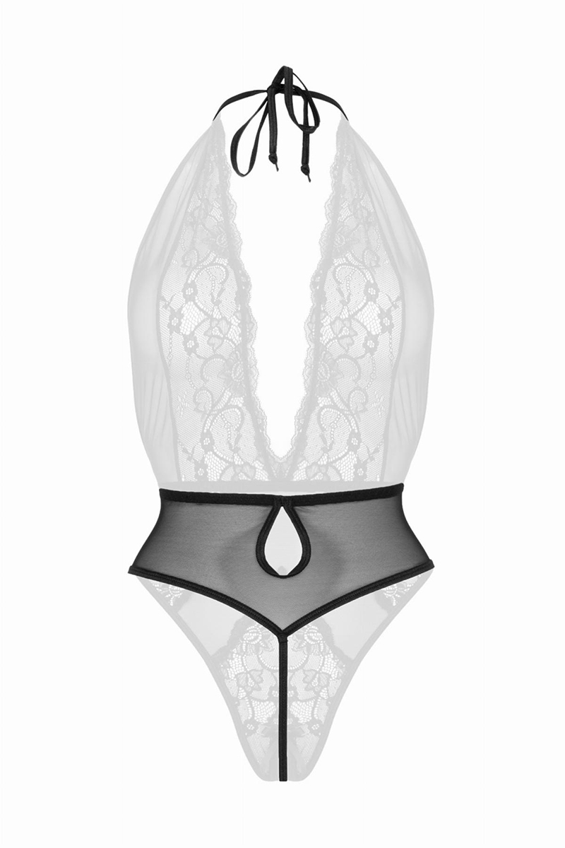La marque Christine présente Dina, un body en dentelle avec dos nu fermé par un nœud et ouverture à l'entrejambe.