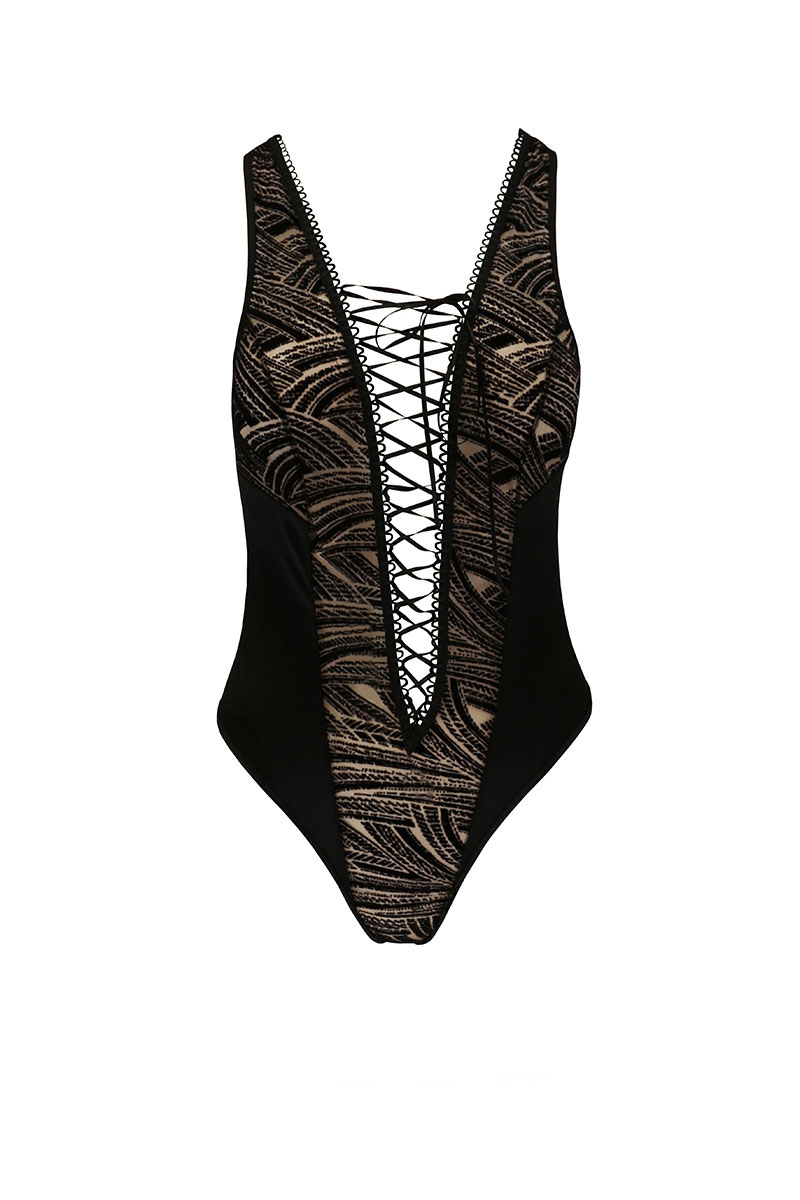 Jolie composition de tissus noir extensible éclairé par du tulle beige floqué, ce body est lacé sur toute la hauteur en un décolleté provocant.