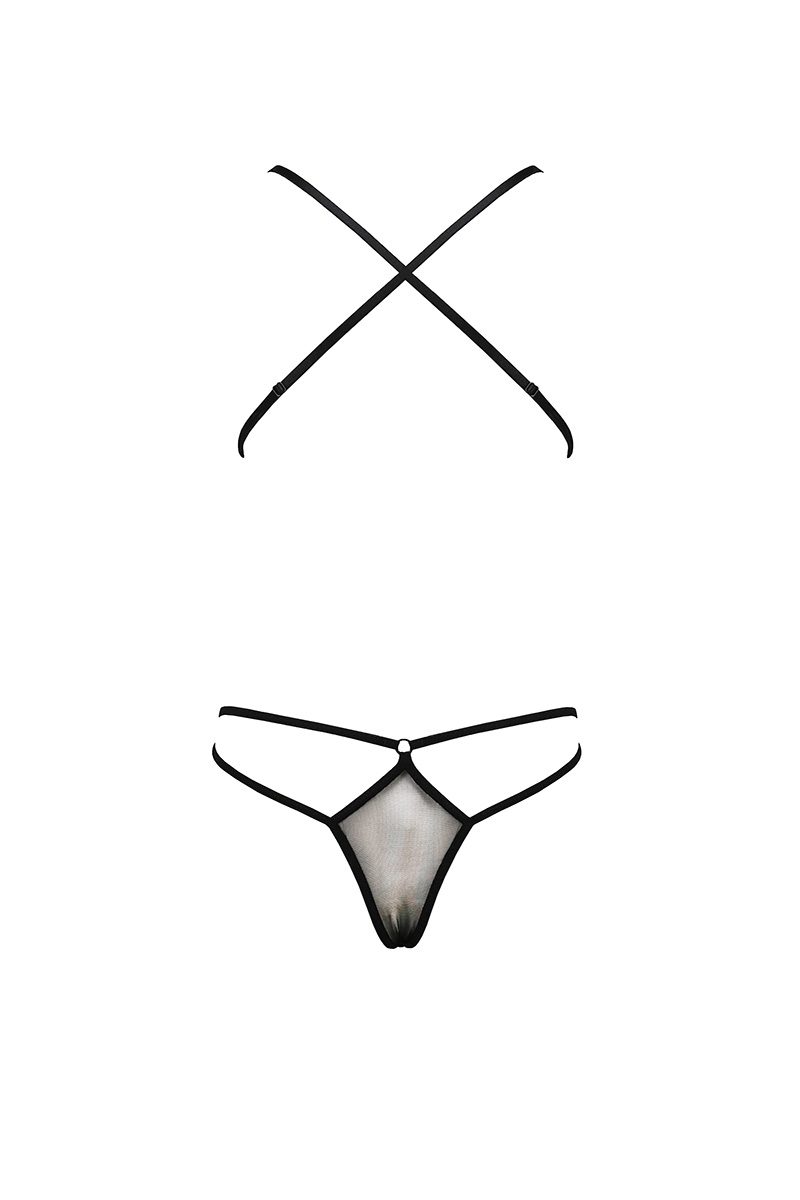 Structuré par des lanières élastiques, le body se porte très près du corps, et possède un jeu de bretelles croisées dans le dos.