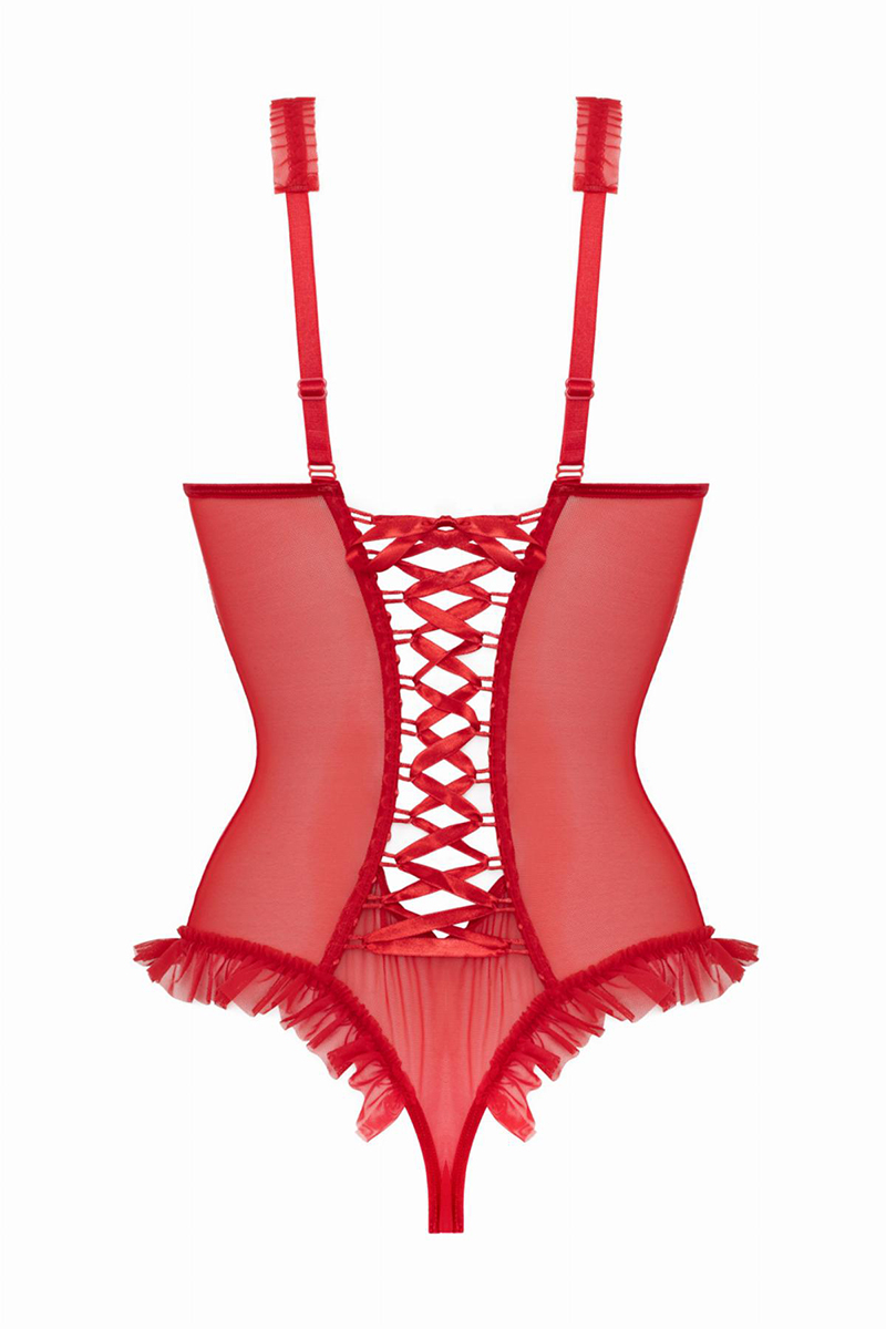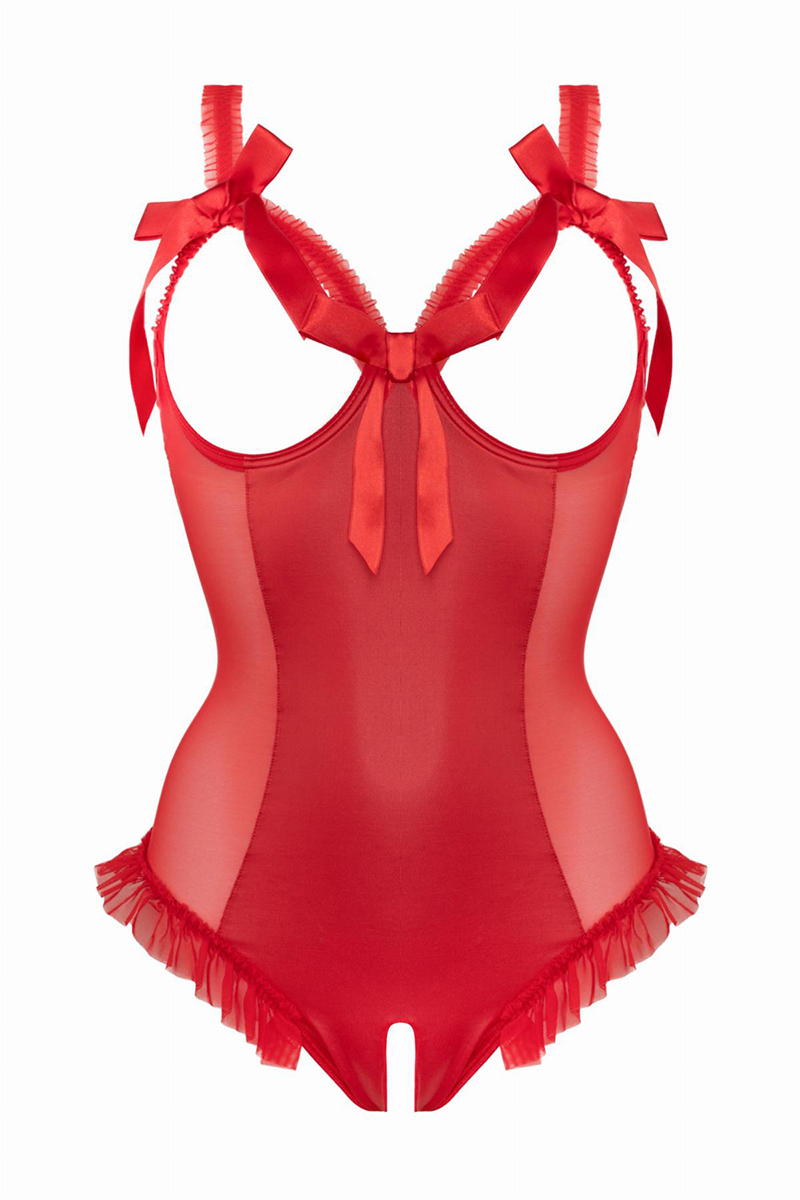 La marque Christine présente le body Mistique, un body coquin rouge avec effet wetlook, ouvert à l'entrejambe et seins nus.