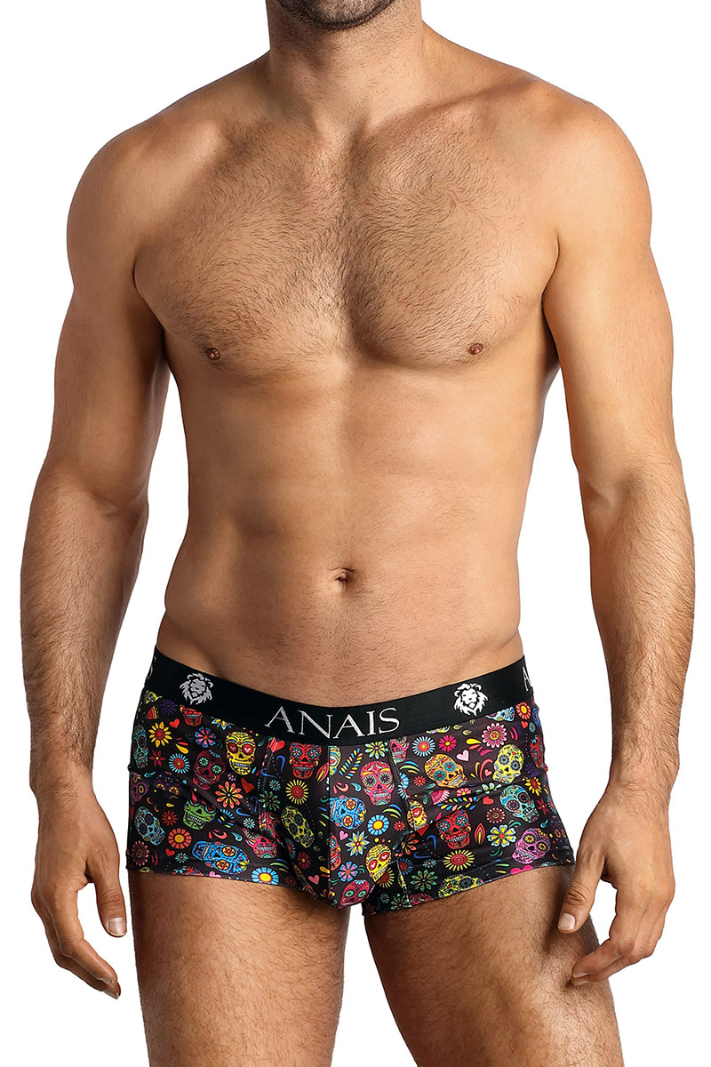 Le boxer Mexico. La large ceinture élastique noire décorée de têtes de lion et du logo de la marque maintient parfaitement ce boxer en place accompagner chacun dans les moments calmes comme intenses. Ce boxer sexy est fabriqué en Tissu doux imprimé de motif de calaveras colorés.
