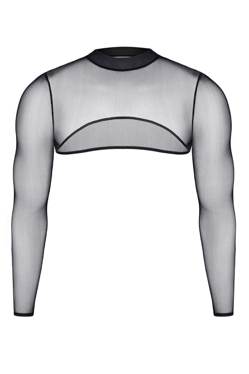 Crop top fabriqué entièrement en tulle noir extensible. La découpe originale de ce top pour homme élargit les épaules et la poitrine tout en laissant apparaitre le dos et le torse.