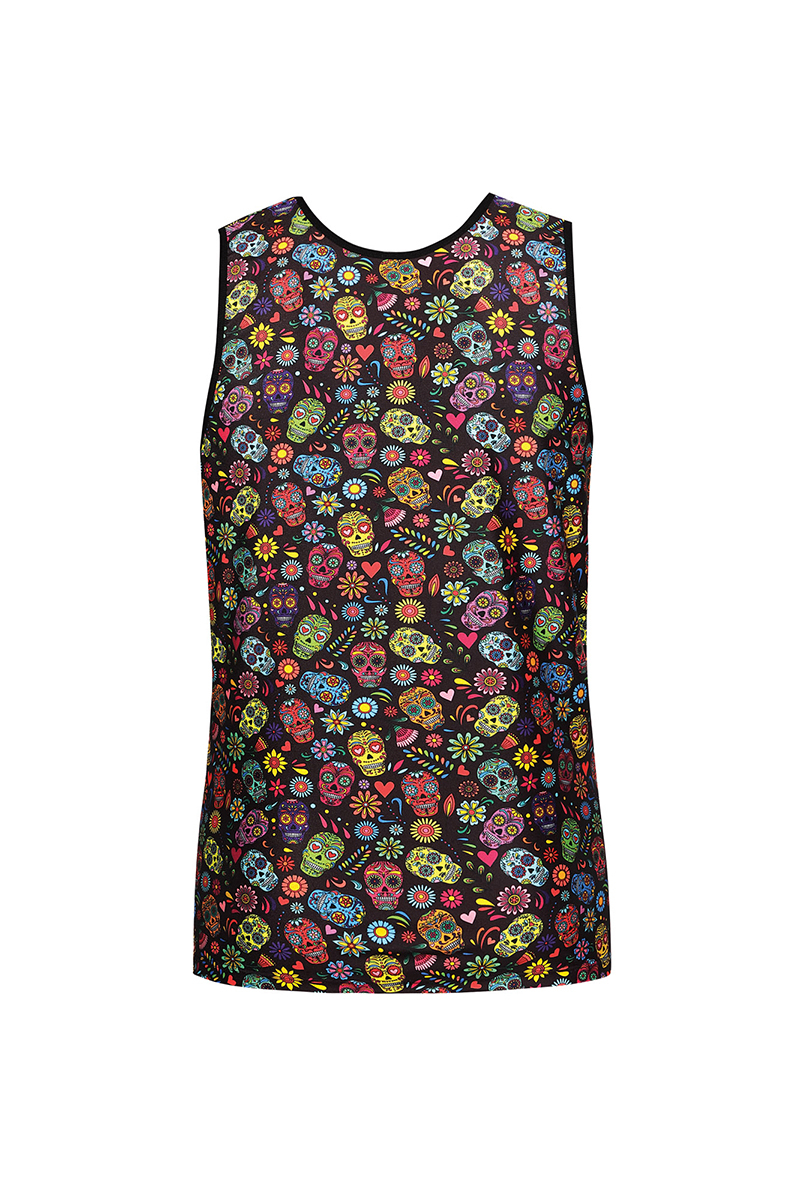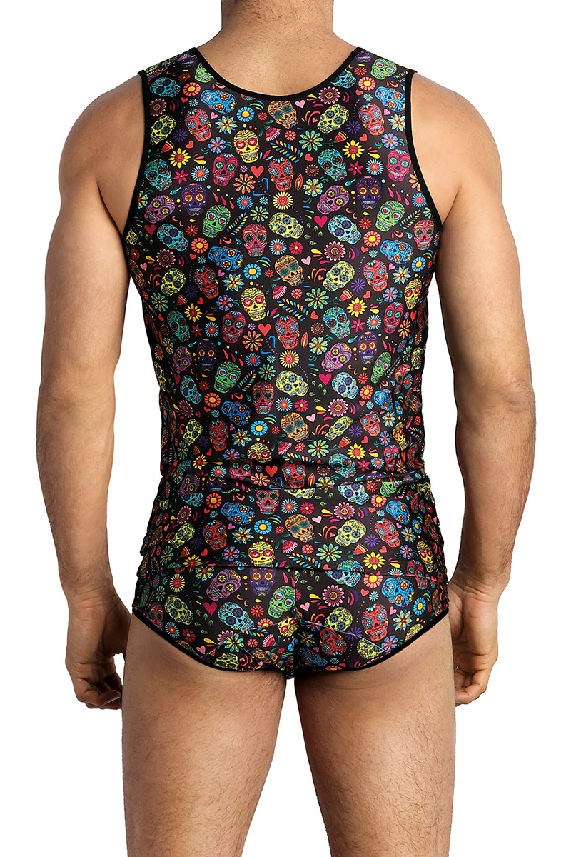 Le débardeur Mexico. La coupe ultra sexy de ce débardeur est accentuée par des galons noirs au niveau des épaules. Ce débardeur sexy est fabriqué en Tissu doux imprimé de motif de calaveras colorés.