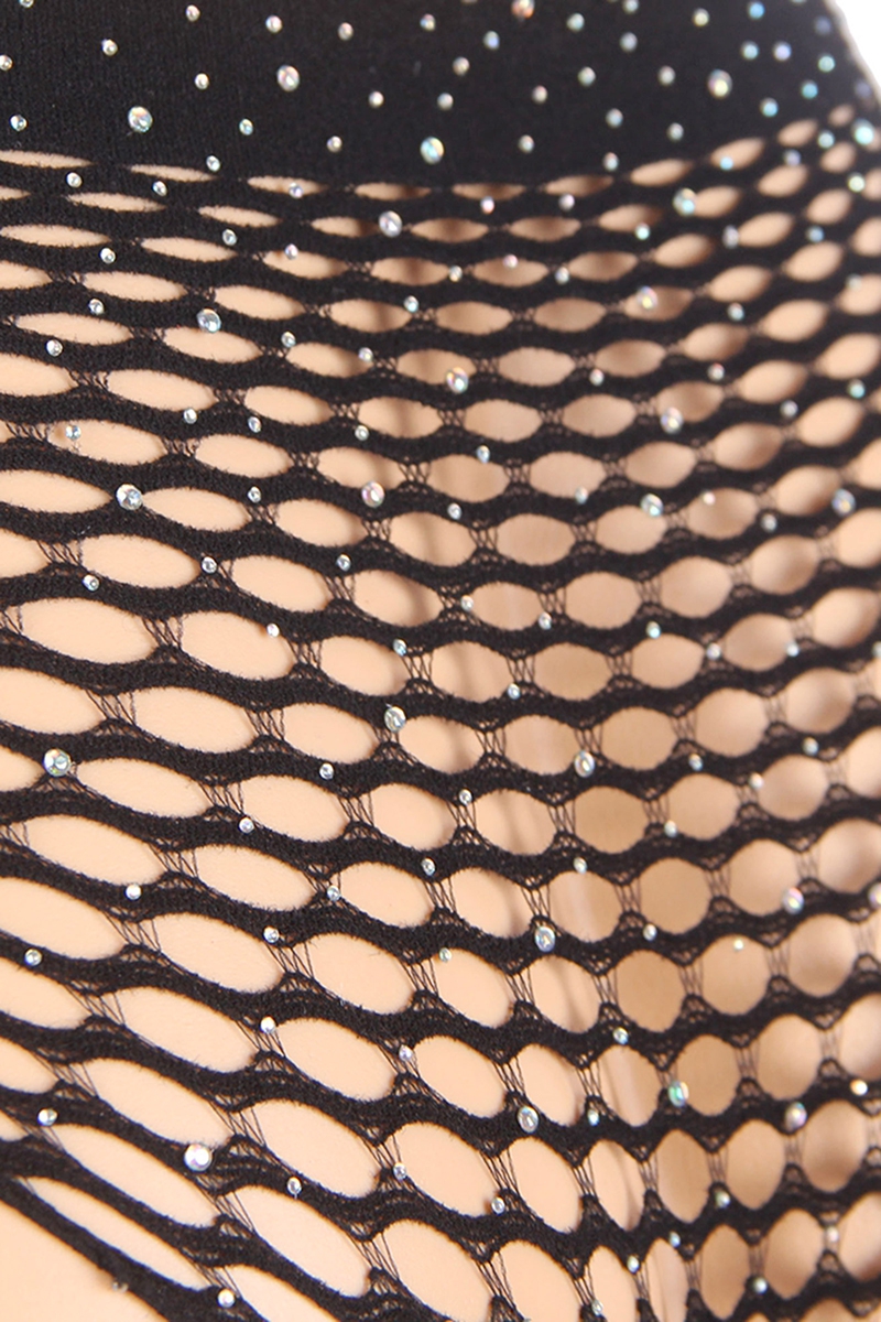 La marque Paris Hollywood présente cet ensemble 2 pièces moulant et transparent, composé d'un top et d'un shorty en résille noire ornée de strass.