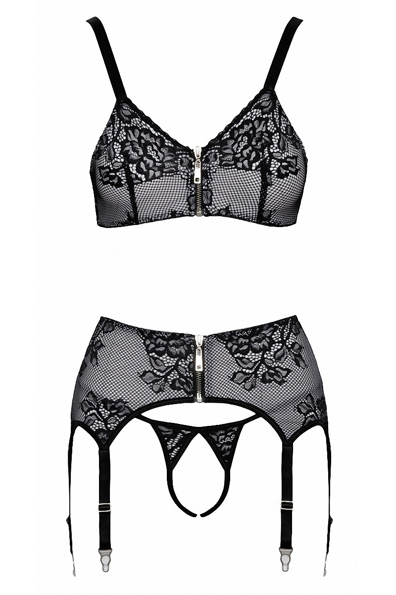 Cet ensemble puise son originalité et son style dans les détails du soutien-gorge et du porte-jarretelles fermé devant par un zip chromé, et dans le dos par une attache à agrafes ajustable.