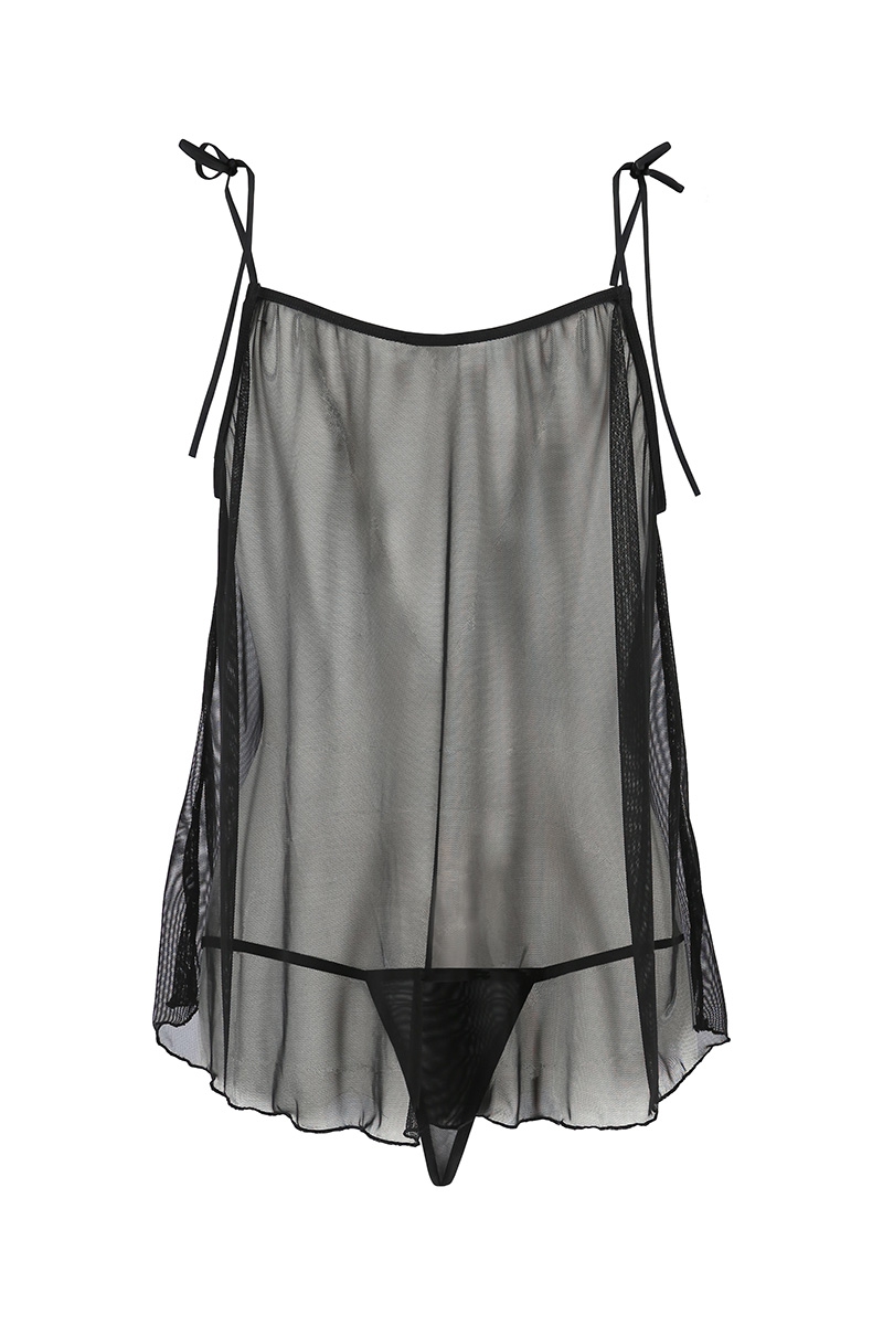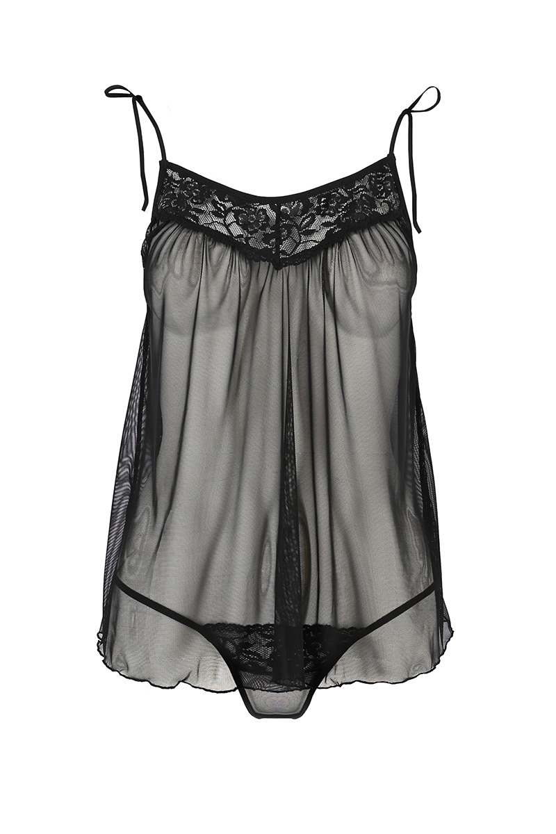 Ensemble nuisette et string en tulle transparent et dentelle.