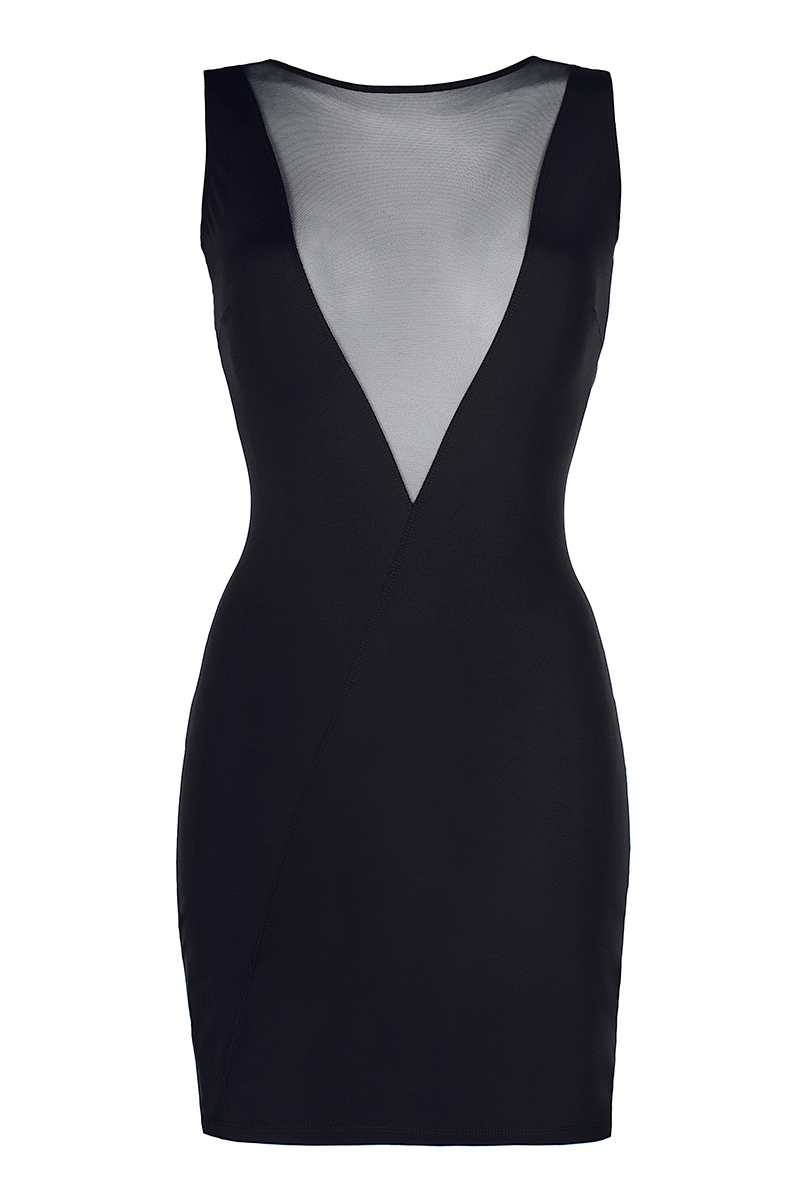 Cette robe fabriquée en microfibre très douce et élastique est découpée à l'avant d'un triangle de tulle noir qui saura jouer avec la transparence et laissera place à un décolleté plongeant. Dans le dos, un effet dos nu sera obtenu grâce au tissu couleur chair et rehausseur d'une décoration en dentelle au motif floral.