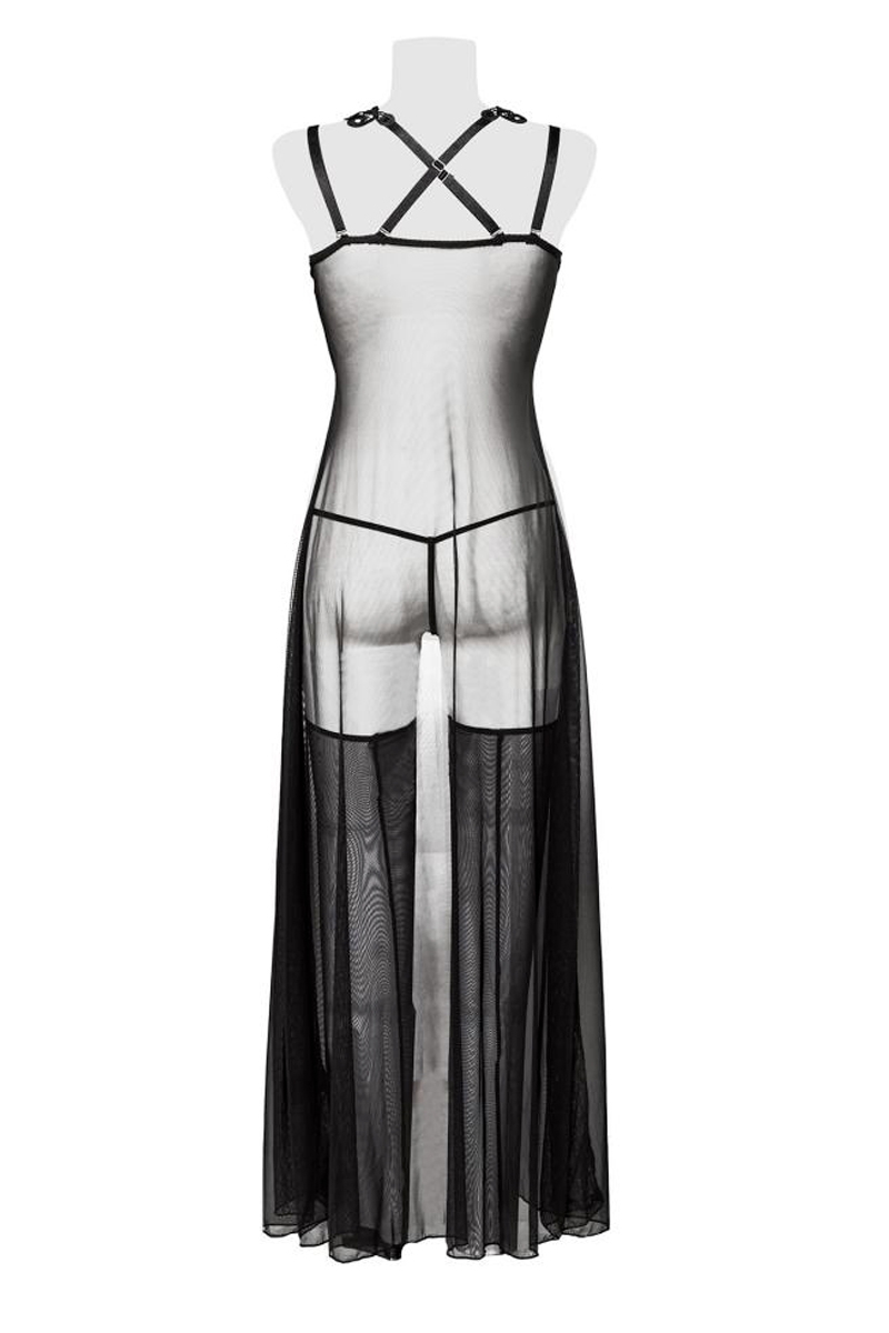 Cet ensemble complet comprend une nuisette en tulle transparente, un string et une paire de bas.