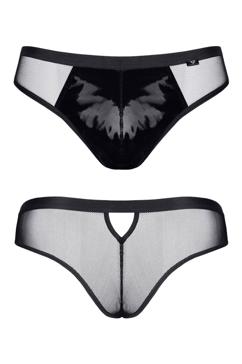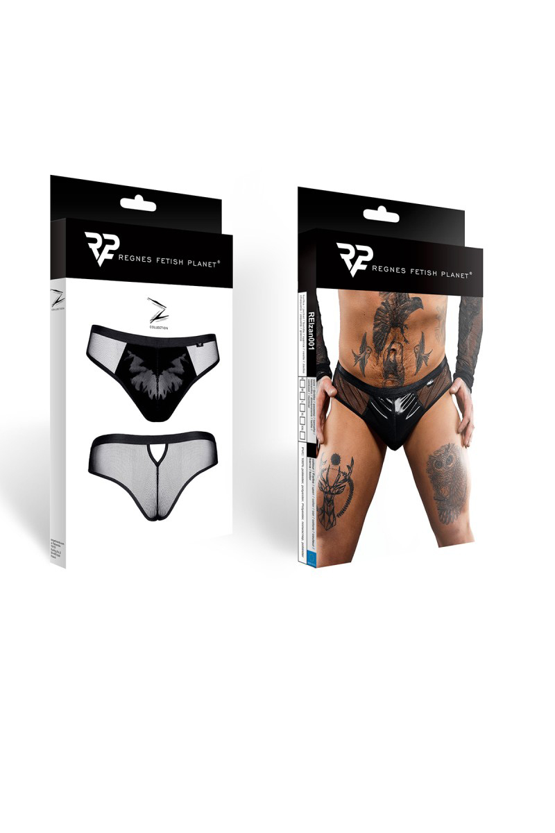 Ce slip de type brésilien est fabriqué en tulle noir extensible qui joue avec la transparence. Au niveau du sexe il est doublé d'un vinyle noir brillant pour attirer l'oeil sans tout montrer. Ce slip sexy est maintenu fermement en place par une bande élastique large qui fait office de ceinture.