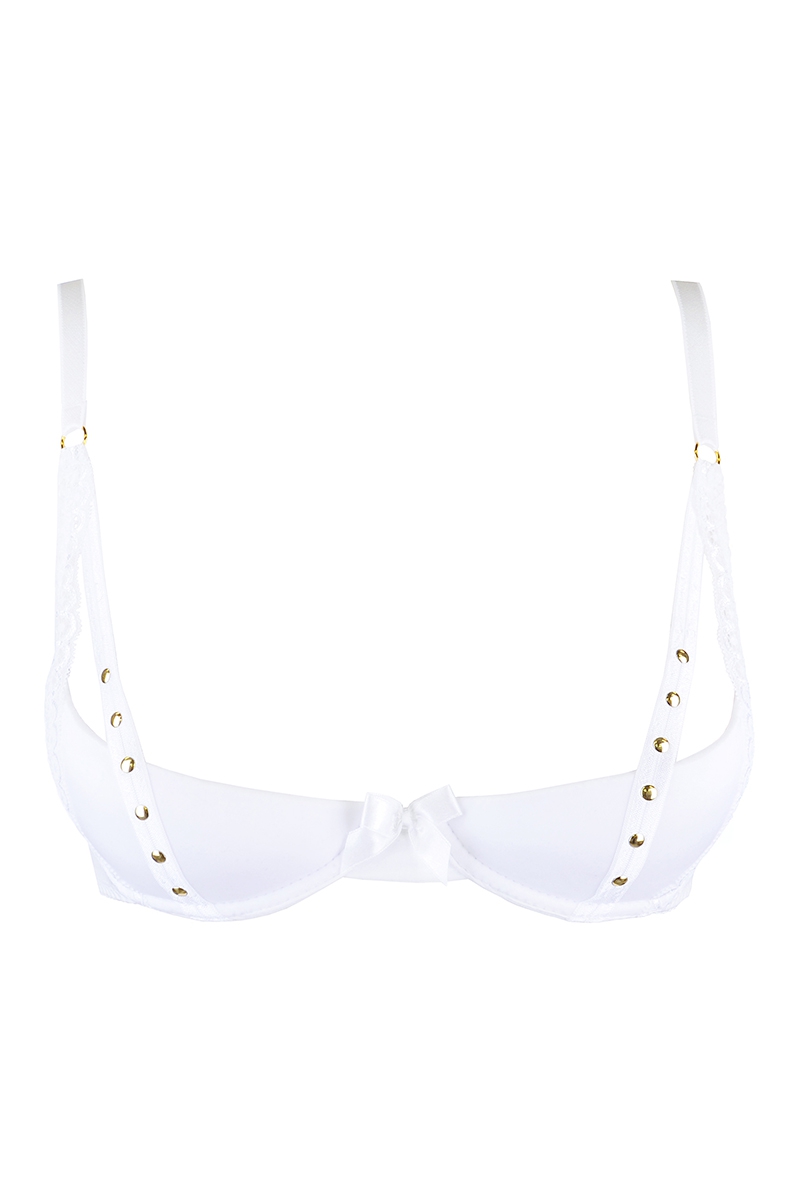 Un triangle de dentelle de chaque côté est bordé d'un élastique blanc incrusté de clous dorés qui illuminent le décolleté. Un petit noeud satiné décore le creux des seins.
