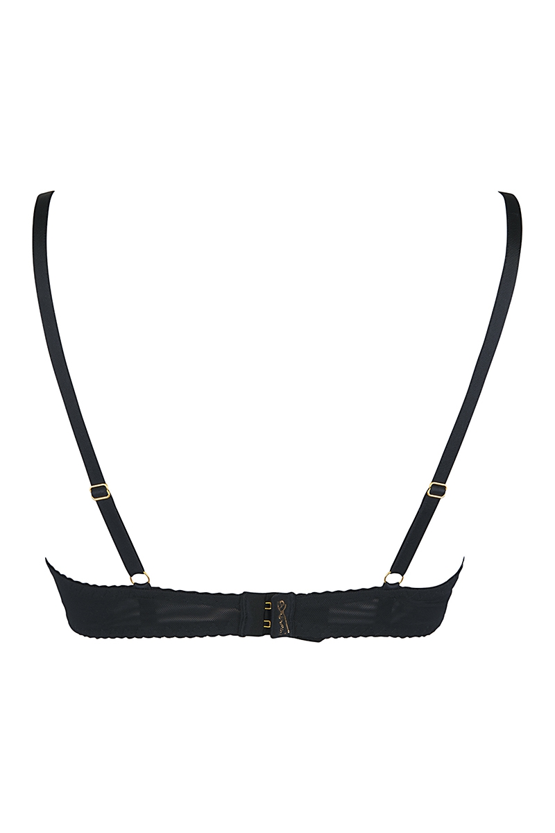 Tous les éléments métalliques de ce soutien-gorge ouvert sont dorés. Un petit noeud satiné décore le creux des seins.