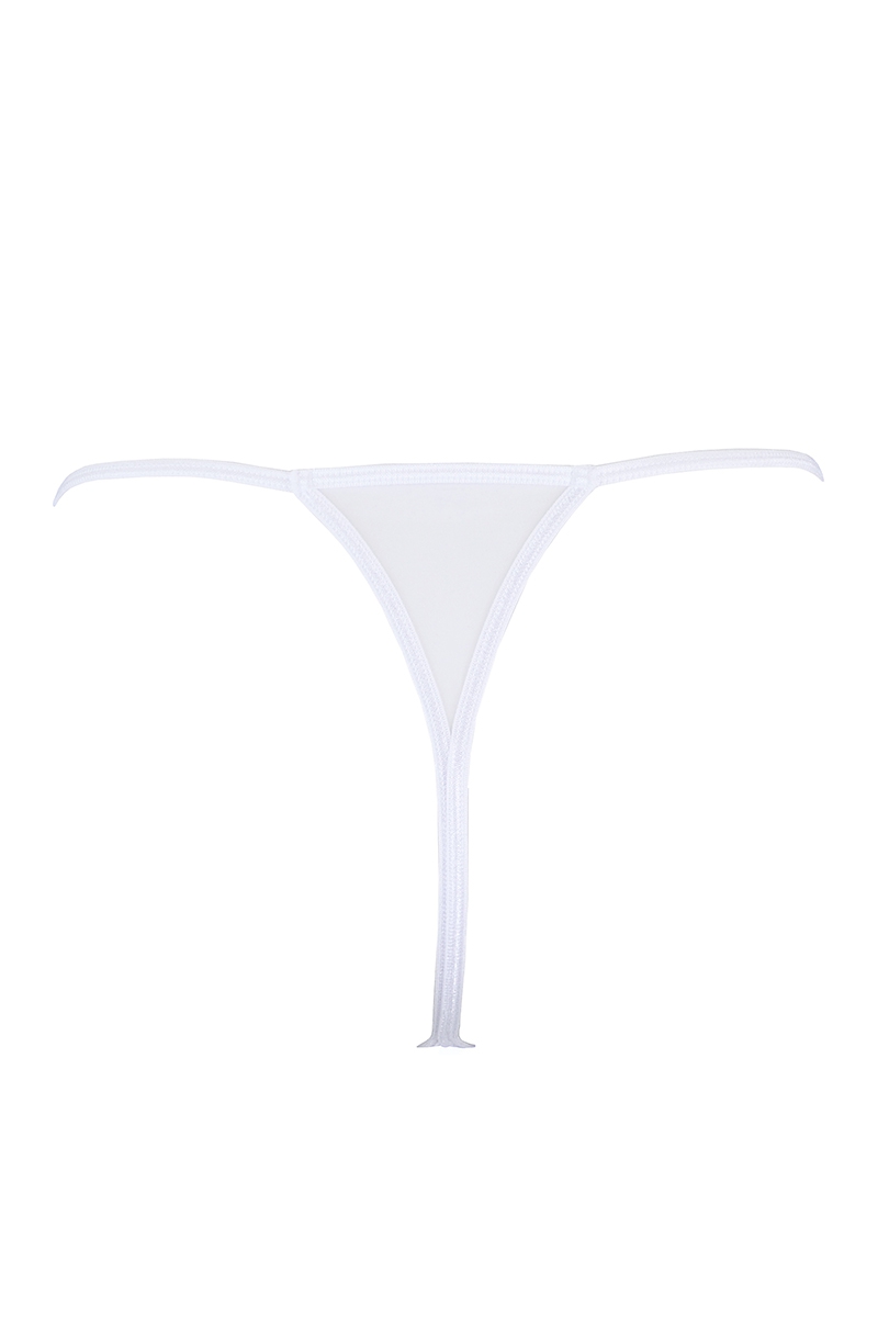 Féminin et sensuel, le triangle sur le pubis est bordé d'élastiques blancs incrustés de clous dorés qui lui donnent une note très chic. Un noeud de satin ponctue la ceinture, et derrière, un triangle blanc surplombe la raie des fesses, attirant encore plus les regards.