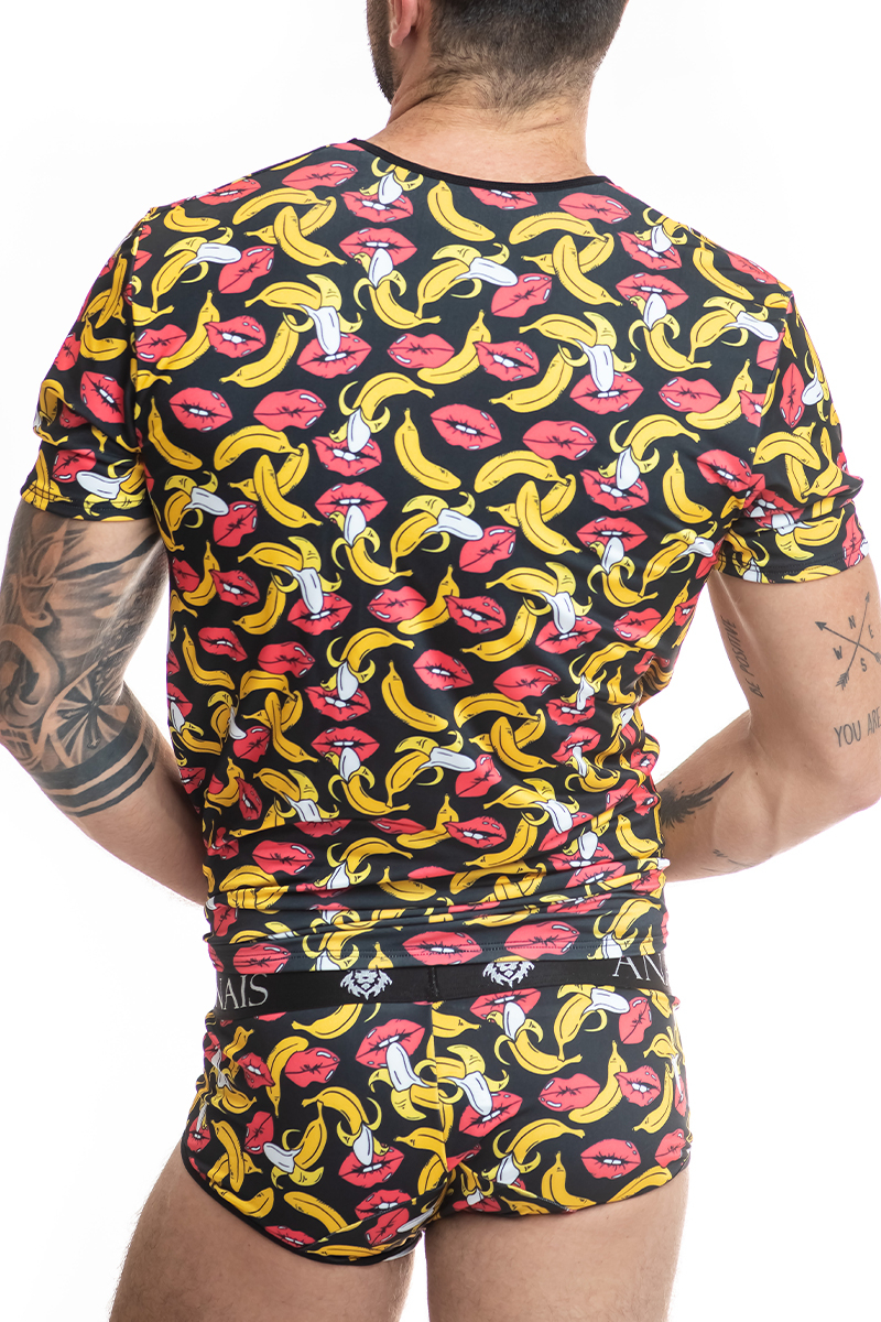 Le t-shirt Banana. La coupe ultra sexy de ce t-shirt en fait une lingerie à porter en toutes circonstances. Ce t-shirt sexy est fabriqué en tissu noir au motif de bananes et bouches pulpeuses.