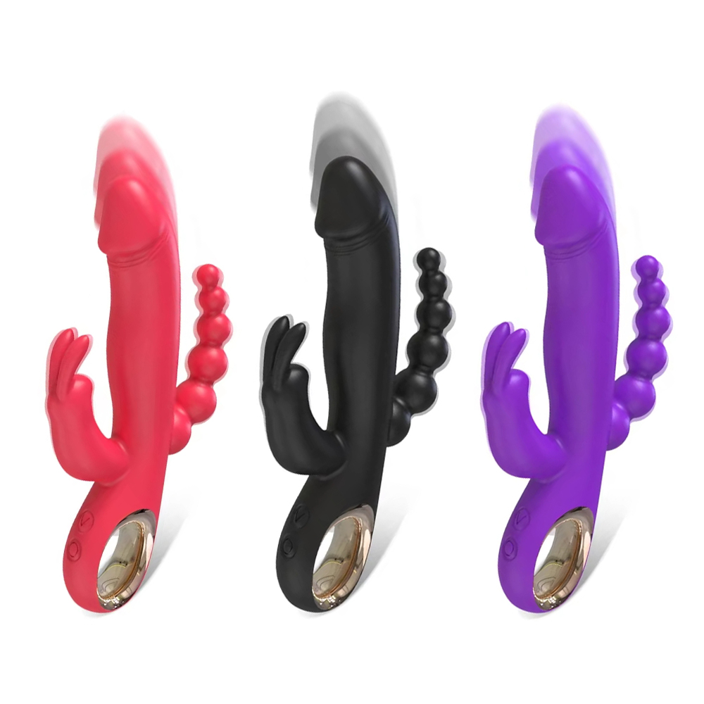Vibromasseur rabbit avec un design offrant une triple stimulation inégalée. Le gode vibrant texturé, conçu pour la stimulation vaginale atteindra précisément votre point G, tandis qu'en même temps les oreilles de lapin masseront votre clitoris et les perles flexibles pourront être insérées dans votre anus.