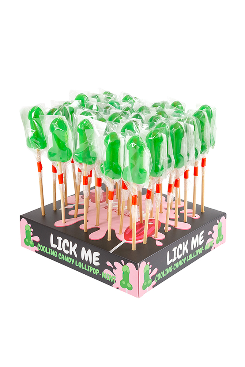 La sucette pénis "Lick Me" parfum menthe avec effet rafraichissant en format de fête : 40 sucettes vertes en forme de pénis sur un présentoir fun et attractif.