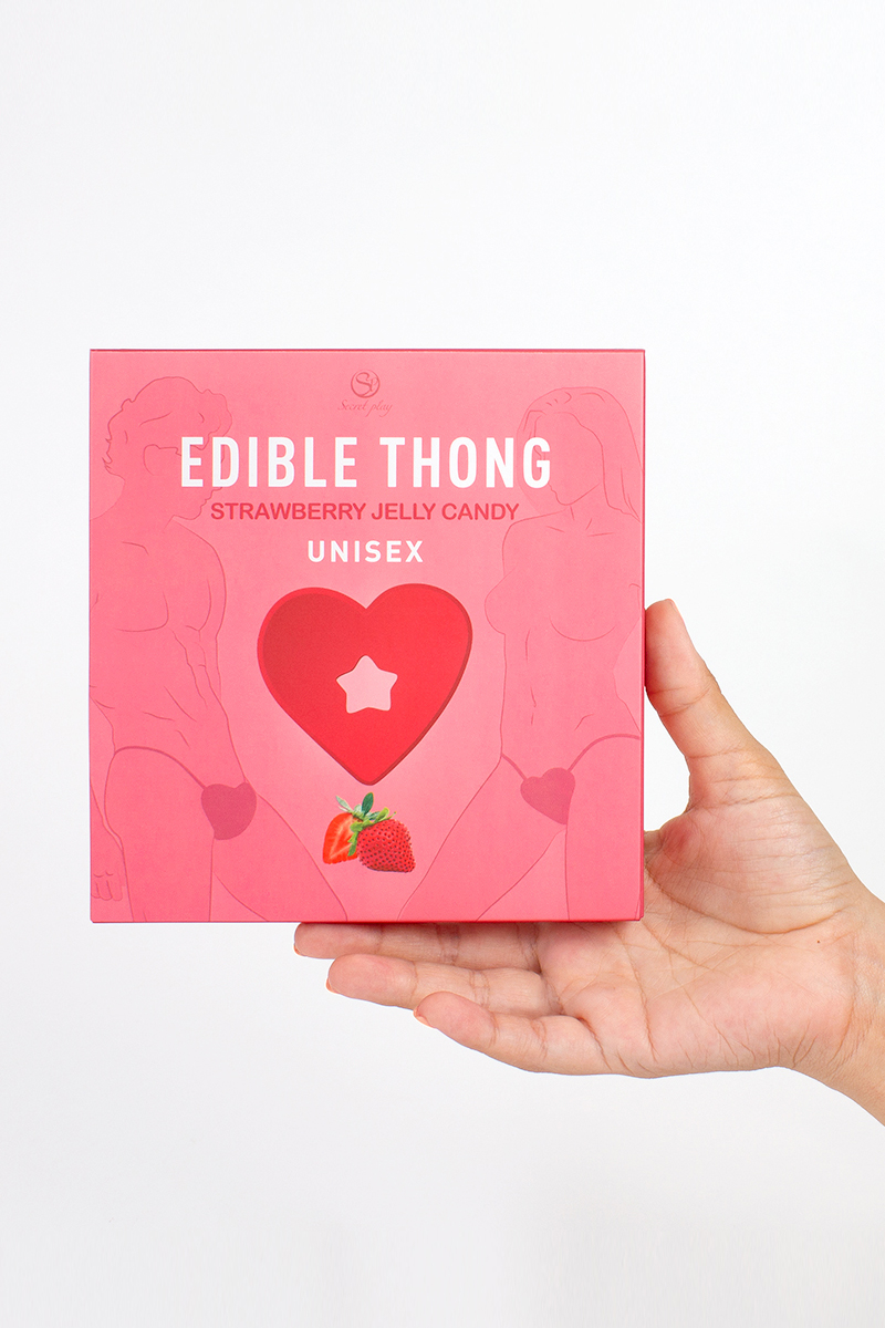 Le string à la fraise Secret Play est conçu en bonbon gélifié sucré aromatisé à la fraise. Le coeur est 100% comestible mais pas ses 3 lanières.