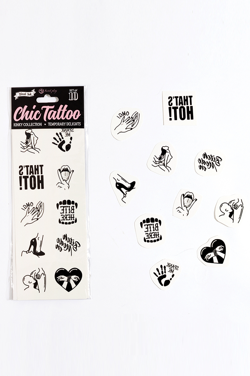 La marque Secret Play propose un set de 10 tatouages temporaires dédiés à la thématique Kinky.