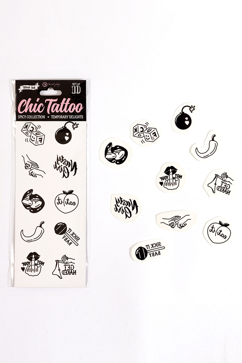 La marque Secret Play propose un set de 10 tatouages temporaires autour de la thématique coquine Spicy (épicée, piquant).