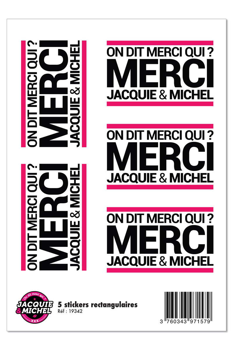 Planche de 5 autocollants blancs rectangulaires Jacquie & Michel.